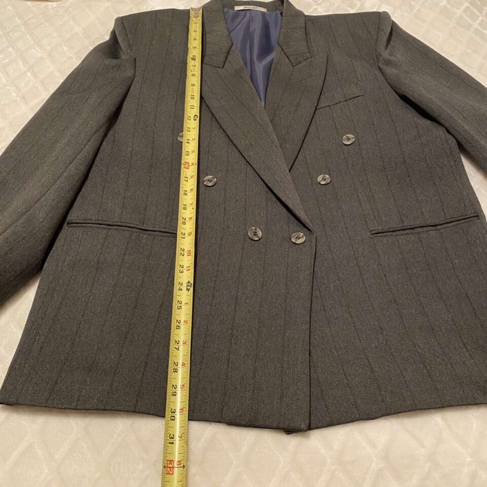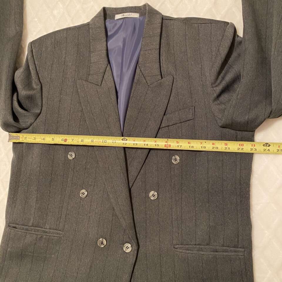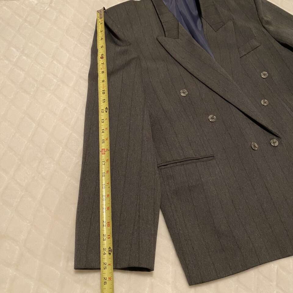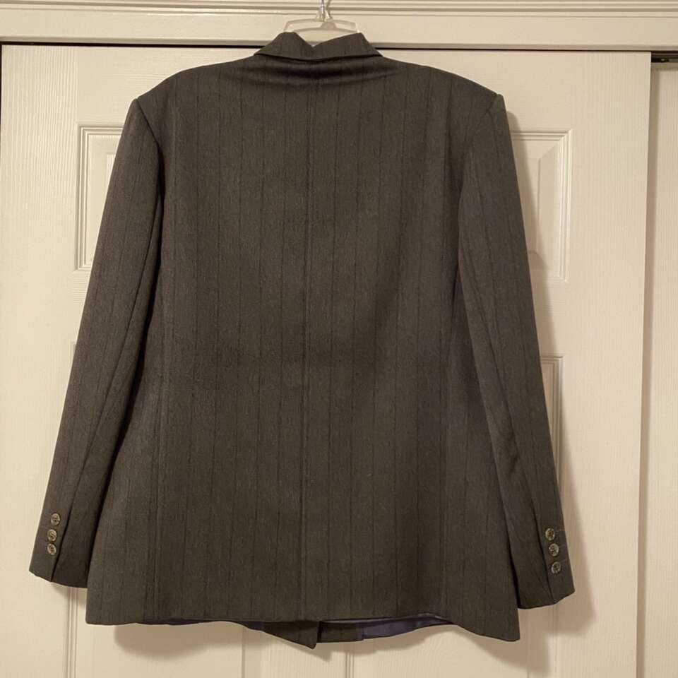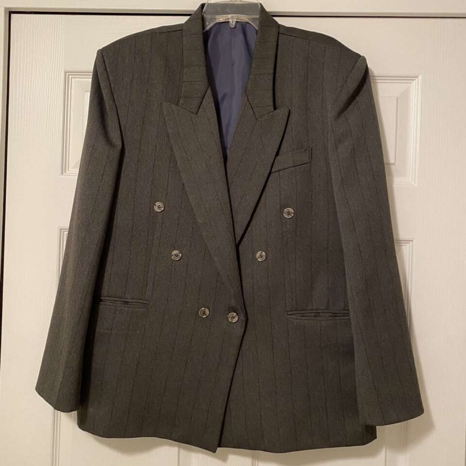 Mens suit coat gray with stripes Great condition, pet and smoke free Approximately size 44. Size tag is faded