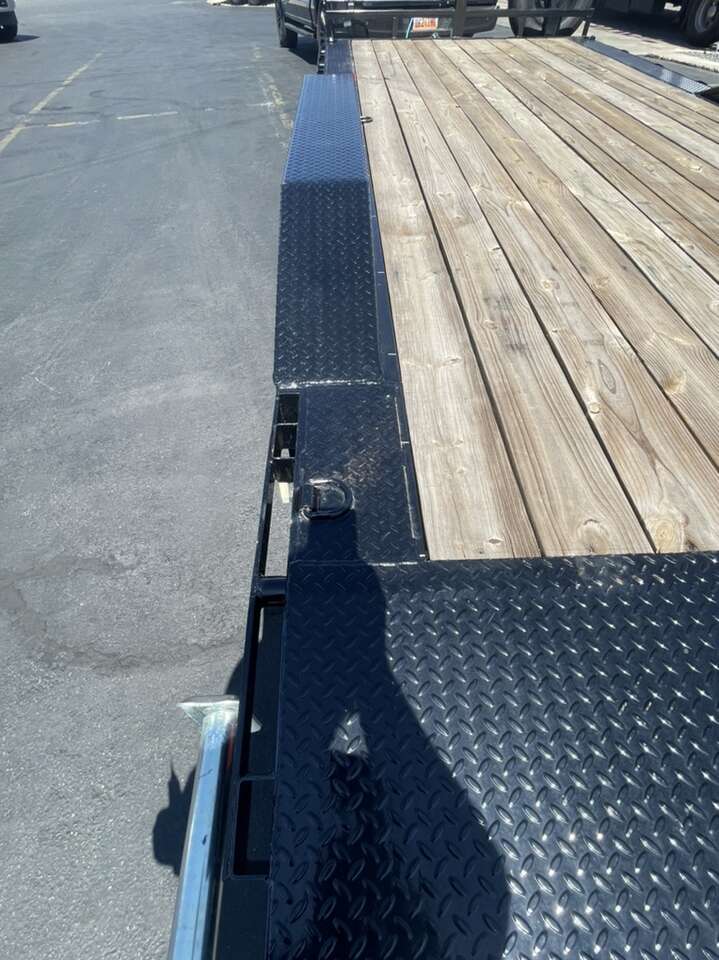 In-deck D-Bolts Heavy duty slotted ramps Load stabilizers 2 5/16” coupler Dual axle Electric breaks on both axles / 4 wheels Build-in tool bin Low profile drive over fenders
