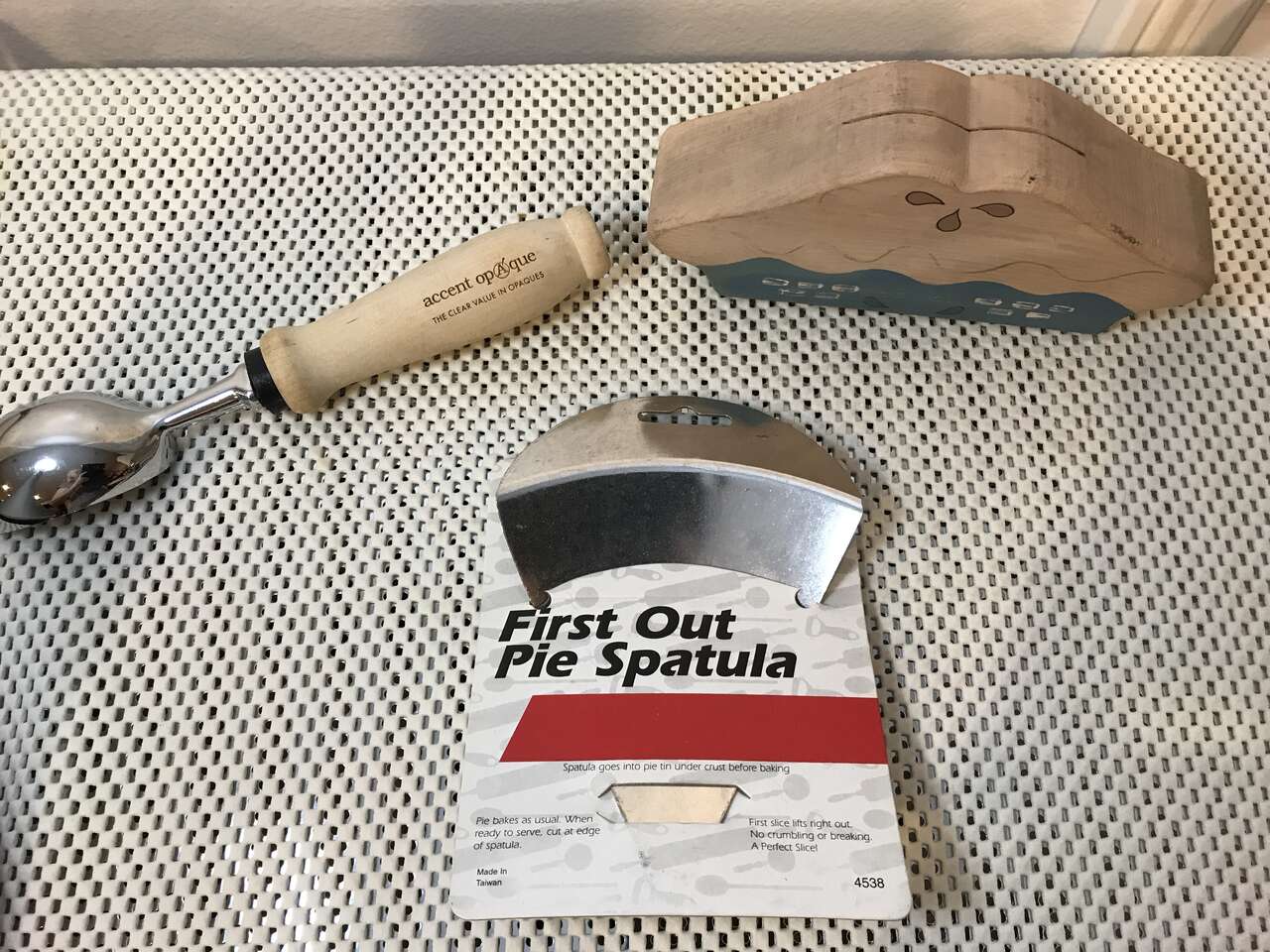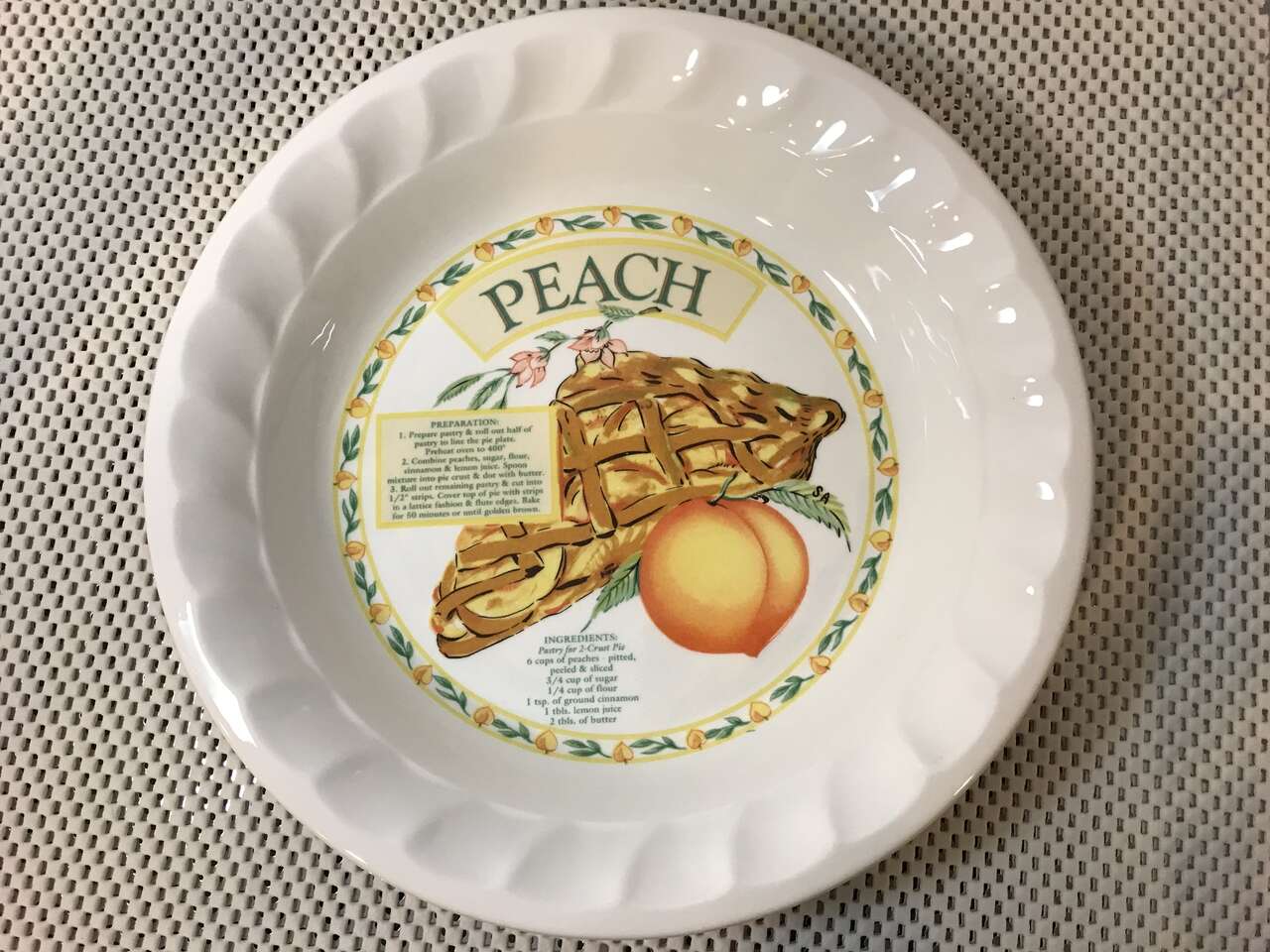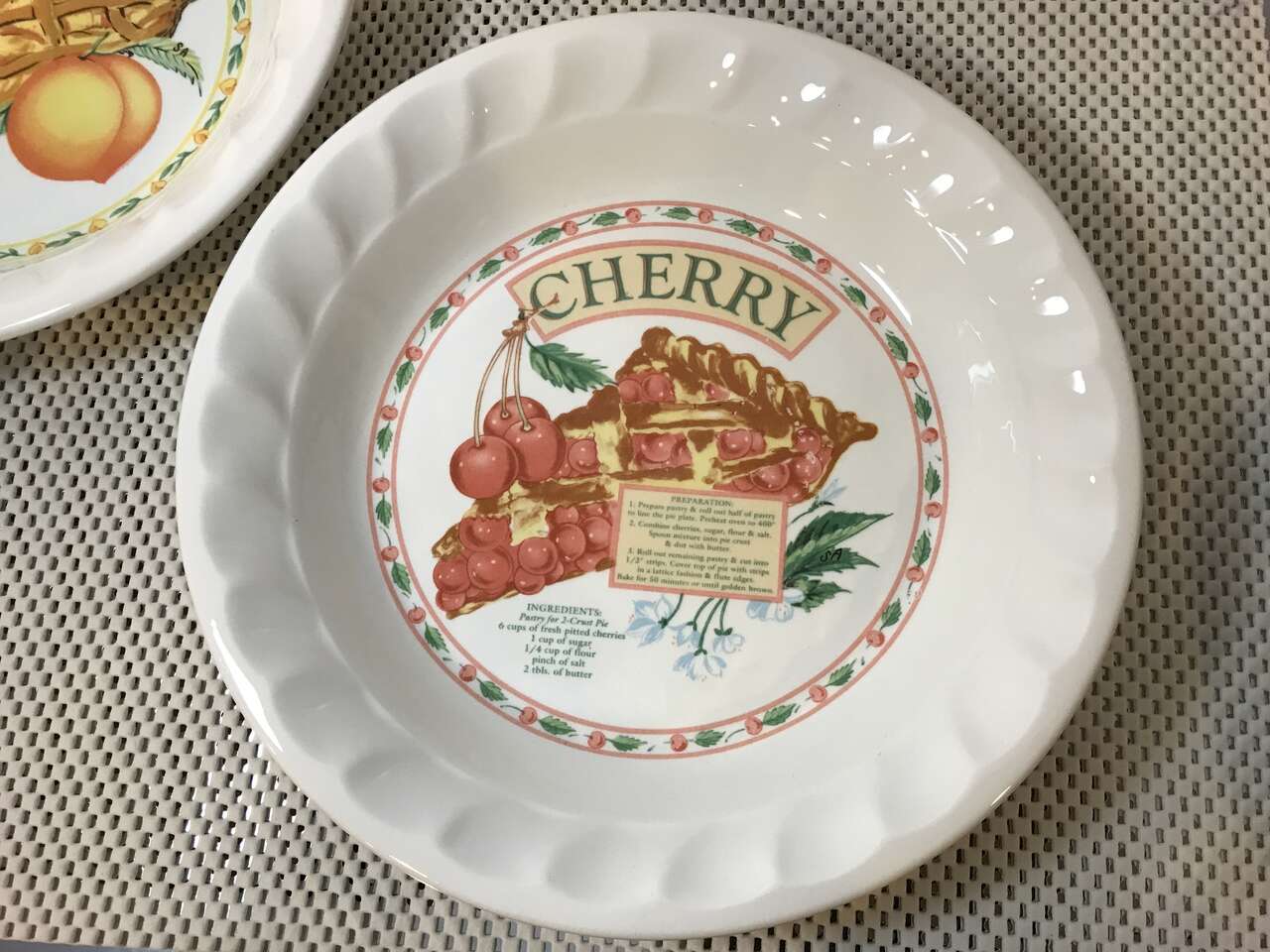 Peach and Cherry Pie Plates Lot, Includes 2 Plates, 1 Roller, 1 Ice Cream Scoop 1 Pie Recipe Holder and 1 First Out Pie Spatula. Plates and Pie server are new. Great for upcoming holidays.