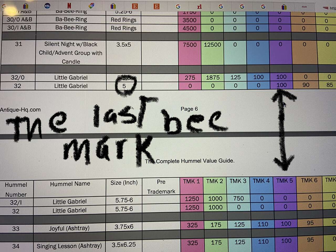 Venmo5" Little Gabriel by Goebel / Hummel, W. Germany #32 TMK5. The makers marks on the bottom indicate the piece bears the last bee logo of the century. The piece also has a faint stamp of 76, circled in the photo of the bottom markings. This piece is the 5, marked 32 with no sub markings. With the blue stamp being placed over the glaze and the 76 mark puts this piece firmly in the TMK 5 collumn in the official Hummel price guide. which valoues the piece at $100. That being said, I am offering this piece at $50, There are no chips, scratches or crackling of the glaze. Colors are vibrant.