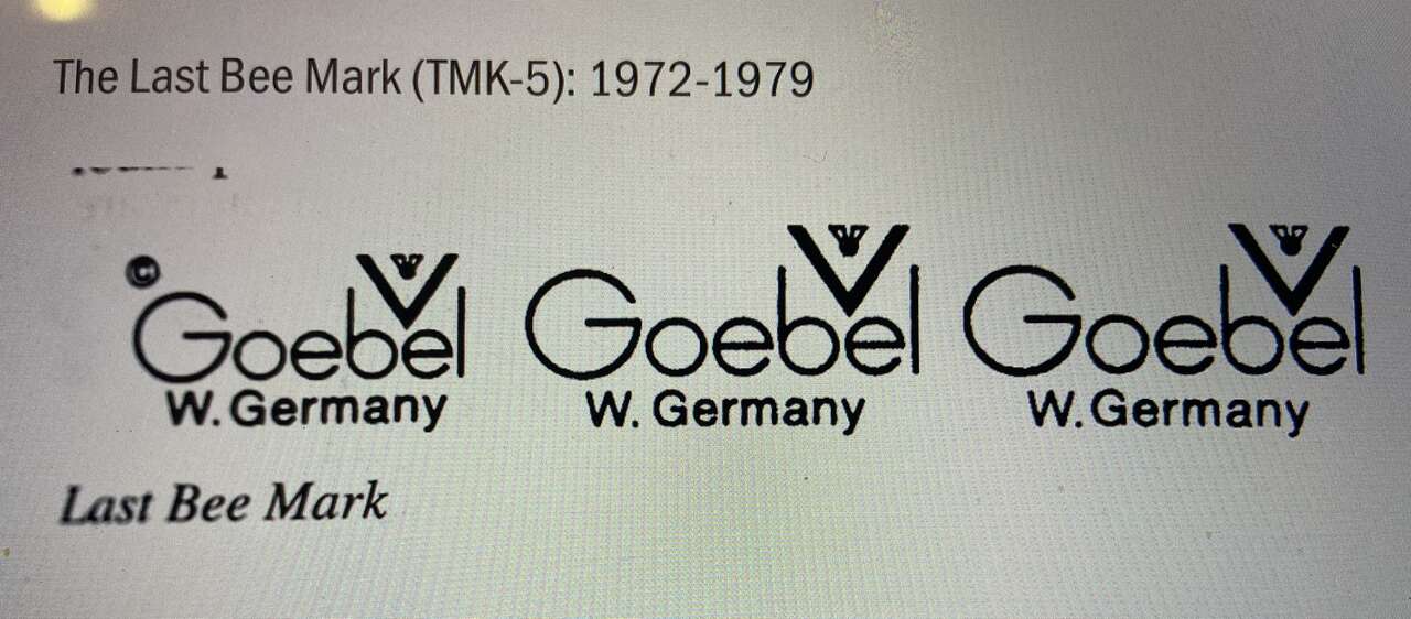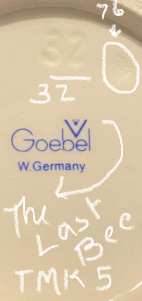 The makers marks on the bottom indicate the piece bears the last bee logo of the century. The piece also has a faint stamp of 76, circled in the photo of the bottom markings. This piece is the 5", marked 32 with no sub markings. With the blue stamp being placed over the glaze and the 76 mark puts this piece firmly in the TMK 5 collumn in the official Hummel price guide. which values the piece at $100.