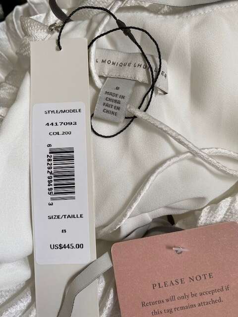 For the reception or the honeymoon, this pleated mini was meant for twirling the night away, featuring an open back with a delicate lace-up closure. By ML Monique Lhuillier Style #66441437 Size 8 Professionally clean Back zip closure Soft A line silhouette 100% polyester; polyester lining Imported Retails for $445 NEW with tags!