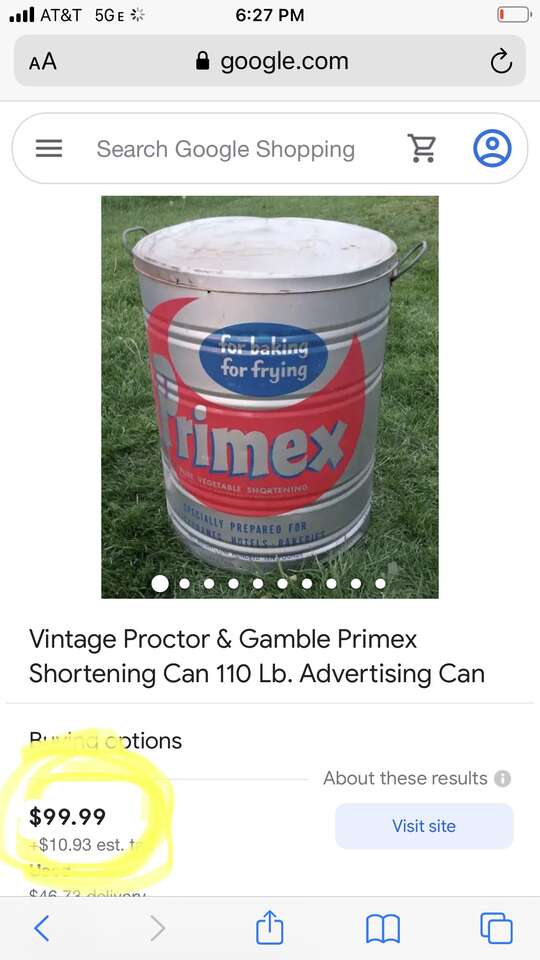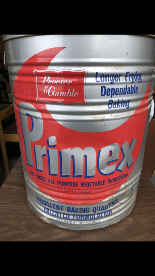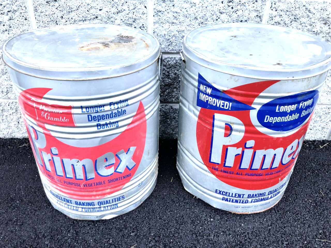 Antique Primex shortening 110 lb advertising storage cans. Awesome decoration I have two of these for sale. $20 per can. Approx dimensions. 16"w x 20"t