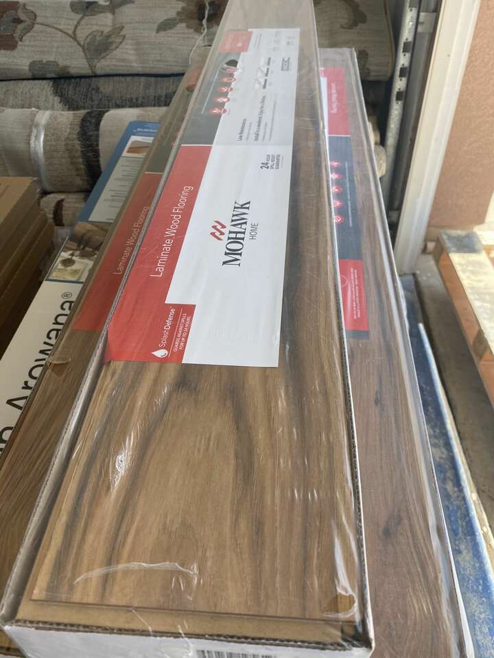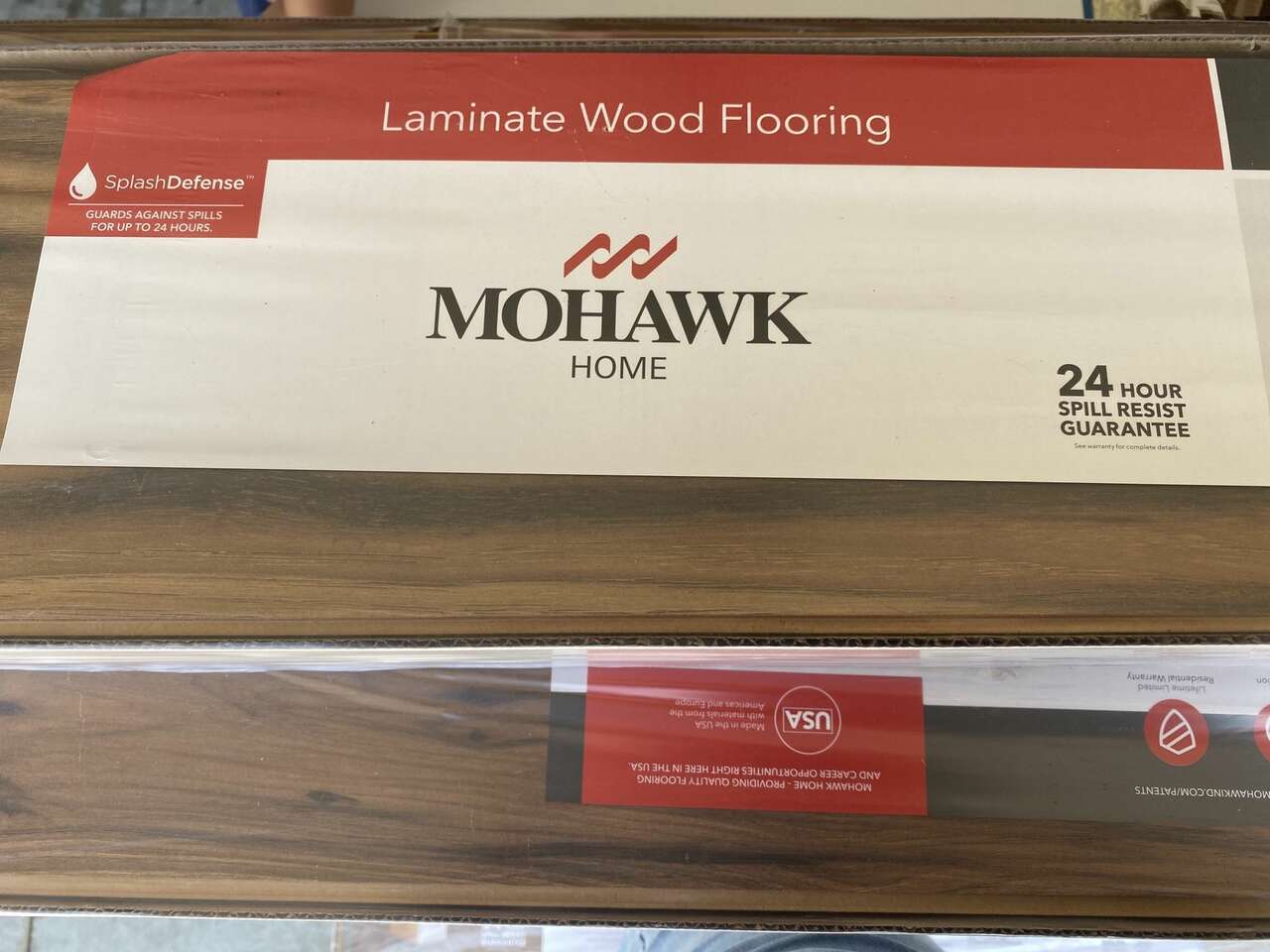 2 Boxes New Mohawk Home Mayfield Hickory Laminate Flooring. 10mm Thick with Splash Defense Technology + 2mm Pad Attached. Price is per box.
