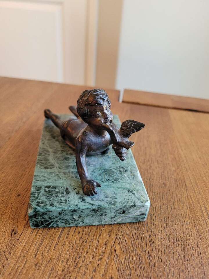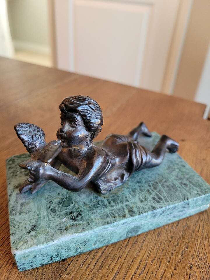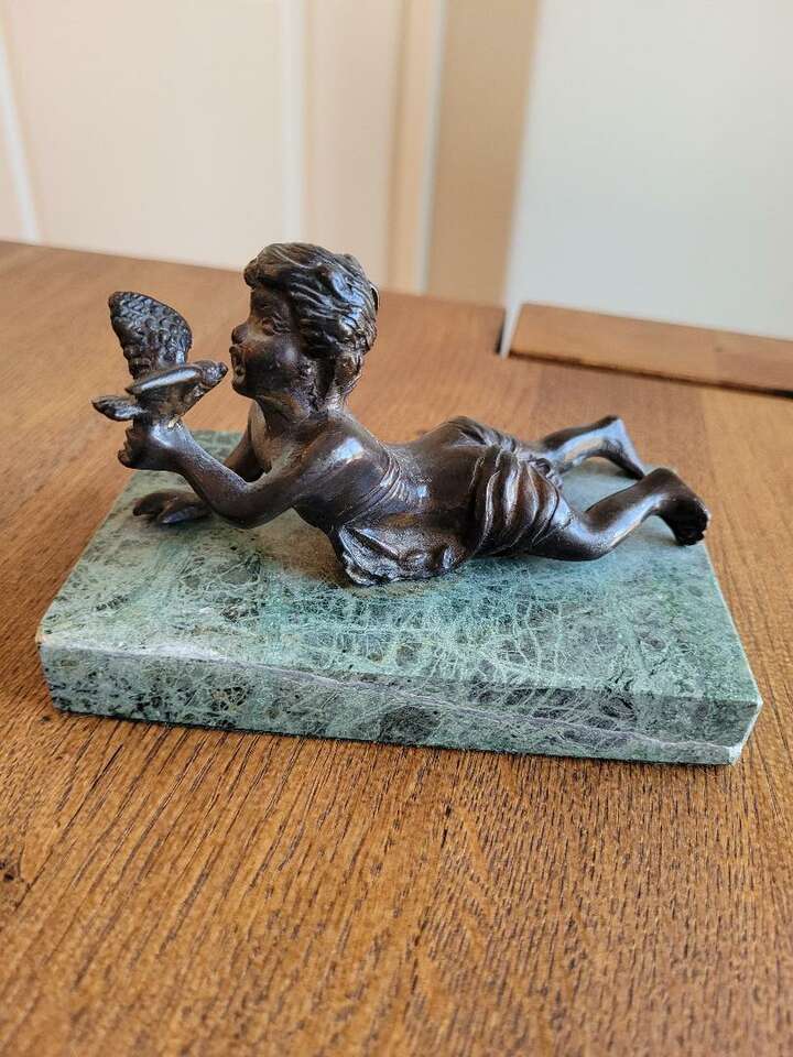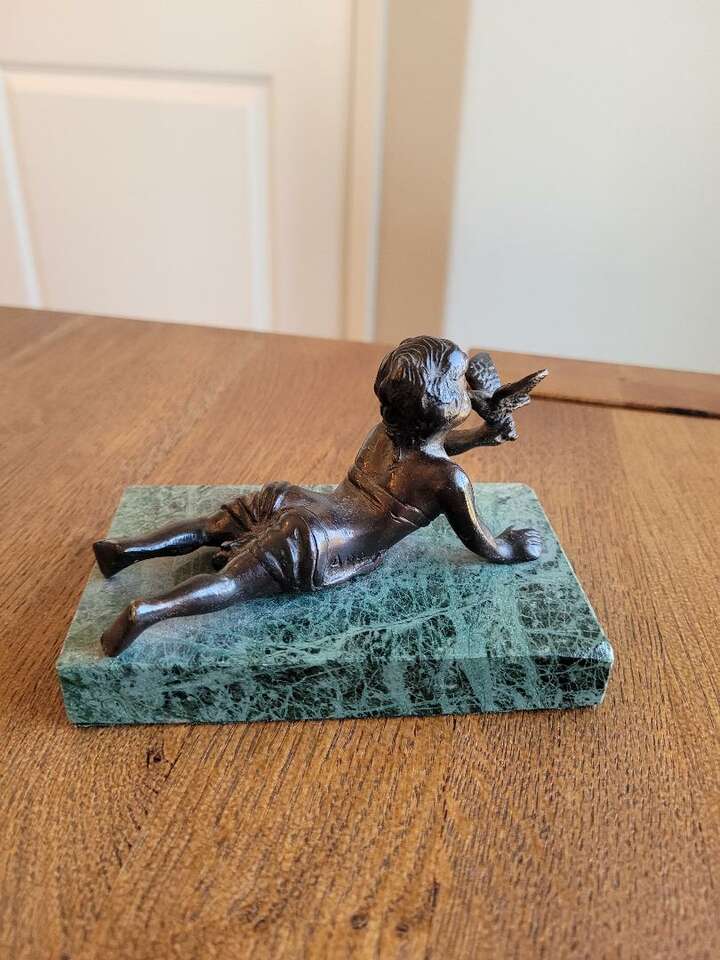 Pure Bronze Sculpture on Green Marble Base, Child with bird- Andra By Sadek Collectable Excellent Condition 5 in width X 3 in deep Cash or Venmo only please