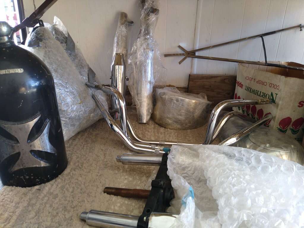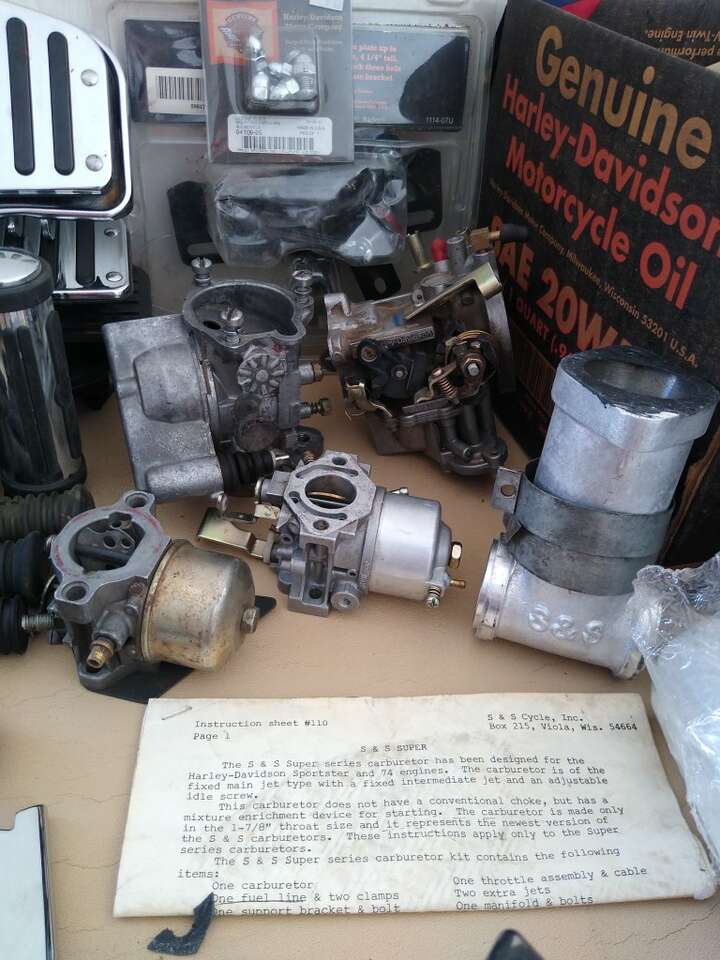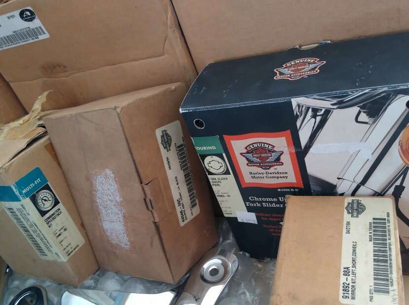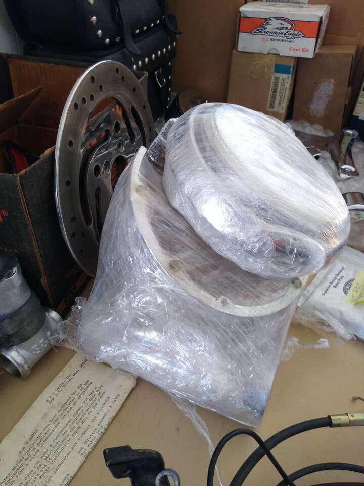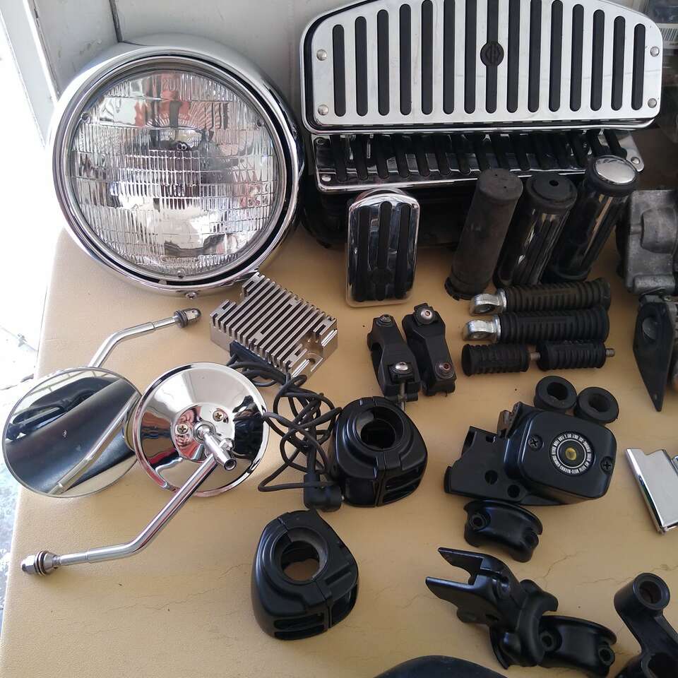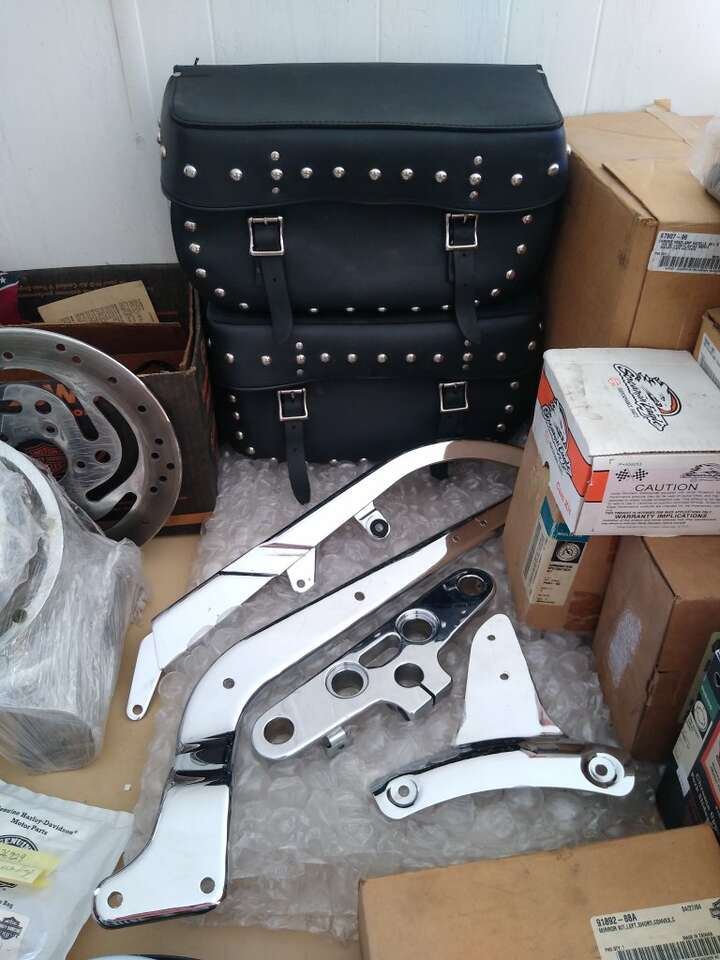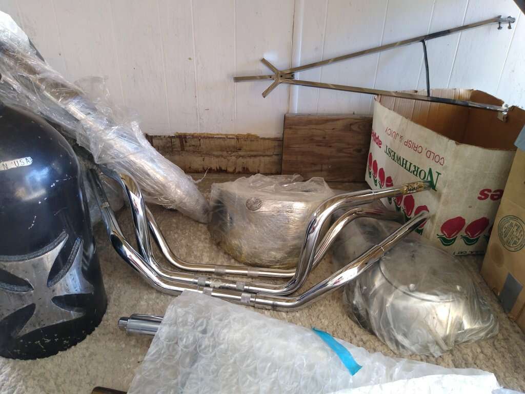 These parts are new, old but new and vintage. Items not pictured you won't find nowhere that's a guarantee. Everything from carburetors vintage headlights new and vintage all the Chrome for a bagger still in the box also another set wrapped in cellophane from an upgrade or a build to parts still in the box from screaming Eagle and Harley. Handlebars oil bag side covers sissy bar seat backrest gosh little bit of everything even new bags and bag inserts will sell fast