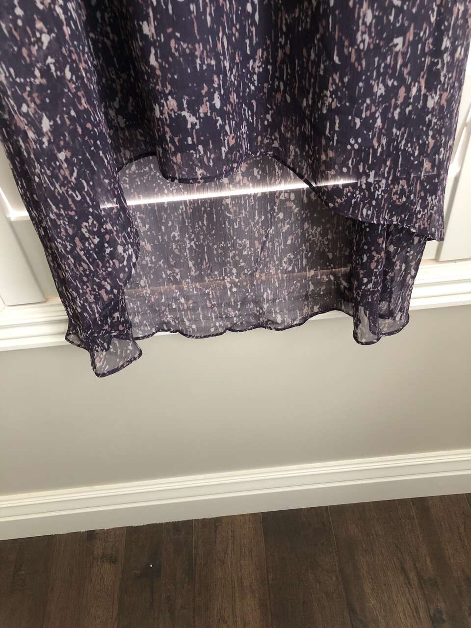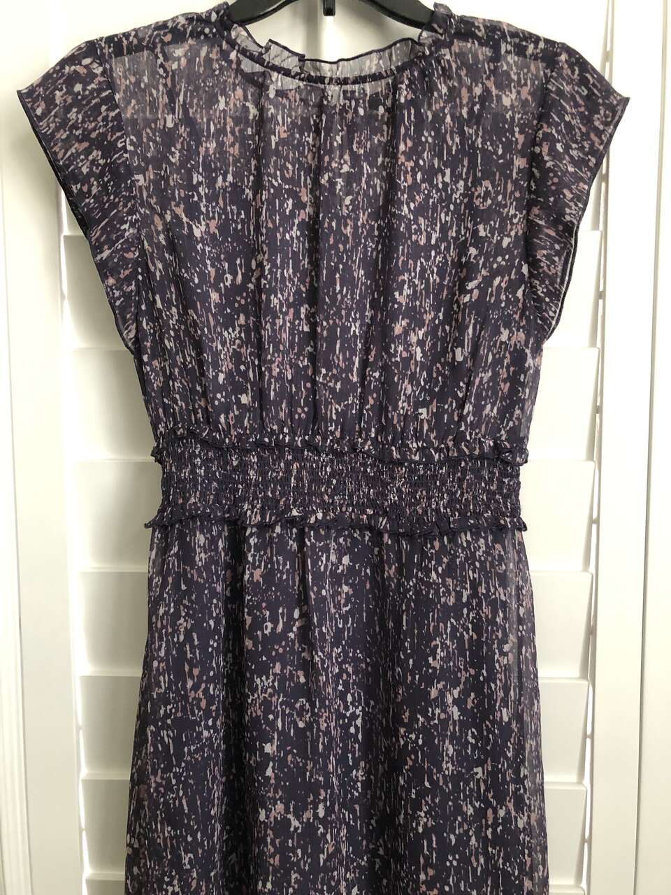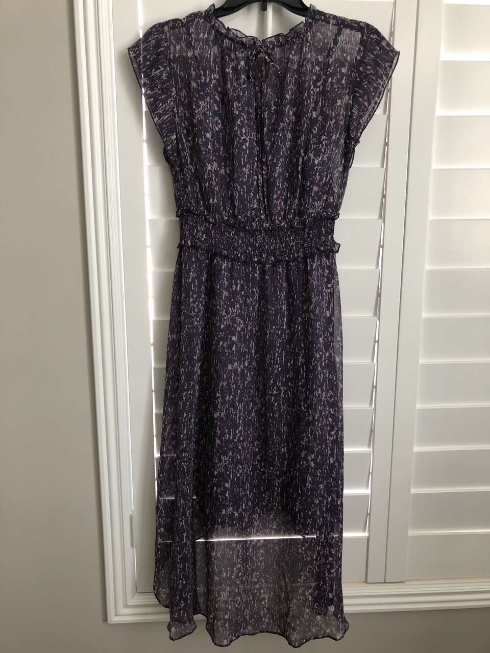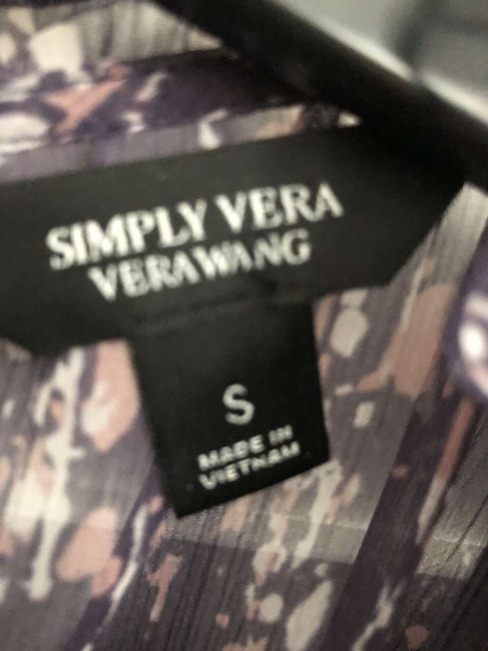 This is a Simply Vera VeraWang purple dress in women's size small. It is very elegant and in excellent condition. It has cap sleeves and is shorter in the front and longer in the back and ties at the neck in back. (See photos)