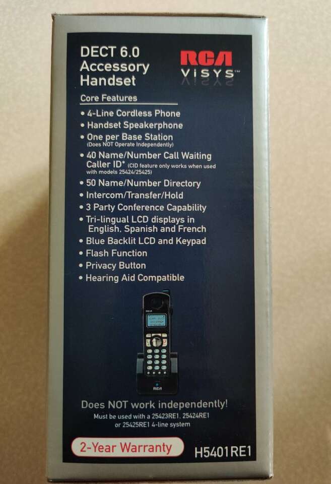 RCA ViSYS Dect 6.0 4 Line Accessory Cordless Handsets Model H5401RE1 Brand New in Box Unopened. 3 - Cordless Handsets $15 ea Does Not Work Independently. Refer to picture for the models of base stations they are compatible with. Text Only 801-916-9191