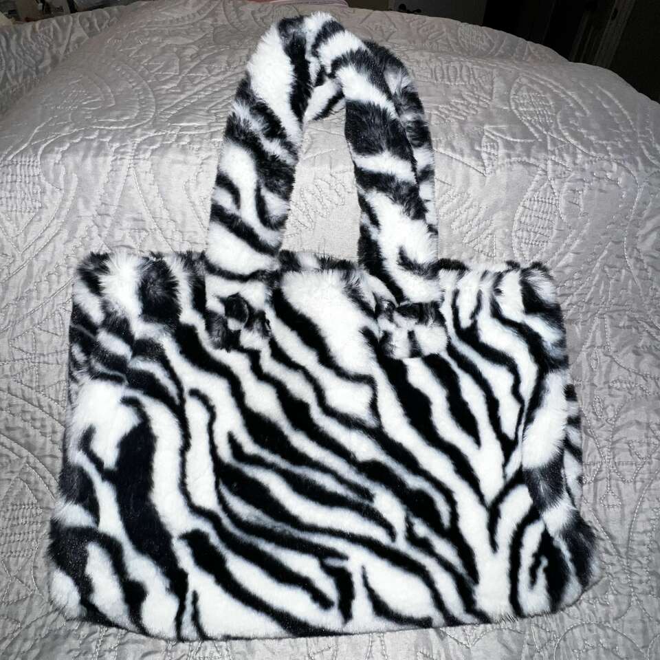 Black White Zebra Animal Print Y2K Faux Fur Medium Tote Bag. Mid-sized handbag rendered in fuzzy faux fur, perfect for toting around. Lined interior with a zip pocket and expandable snap closure.