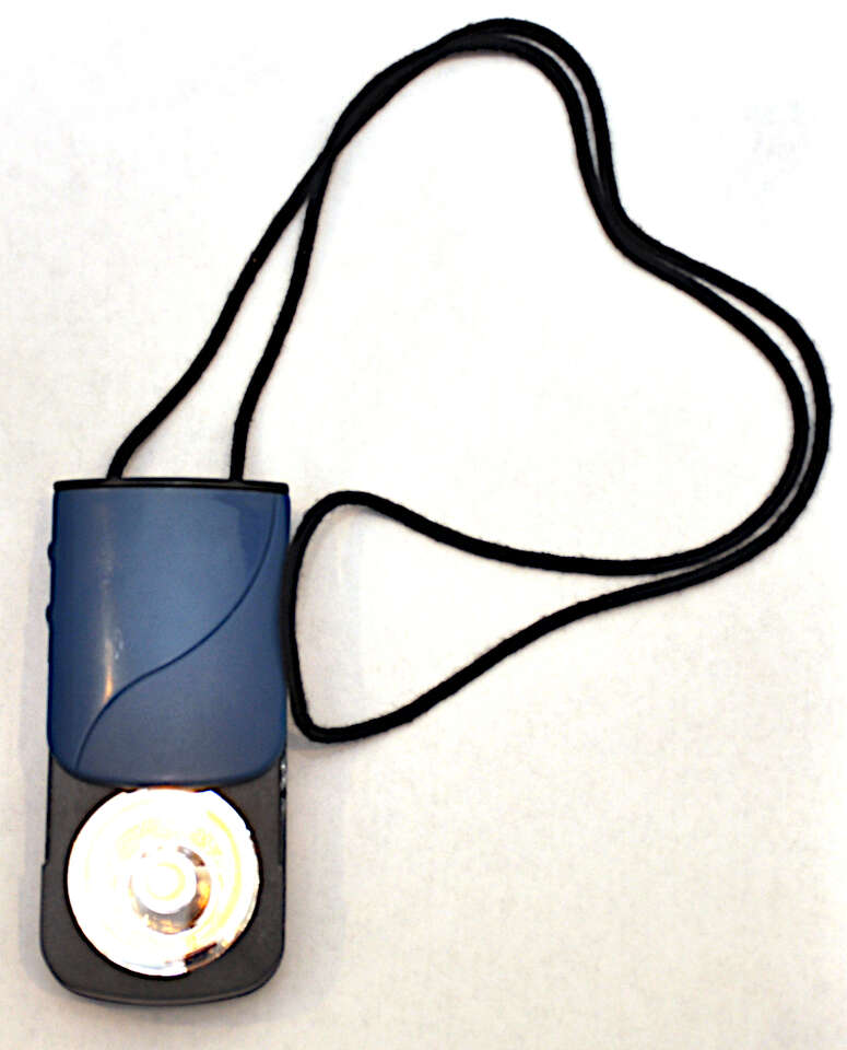 This flash light measures about 2 x 4.5 inches and hangs down to about mid-chest on an adult. Cover slides open to turn on the bulb. Takes 3 AA batteries. Also has a belt clip on back.