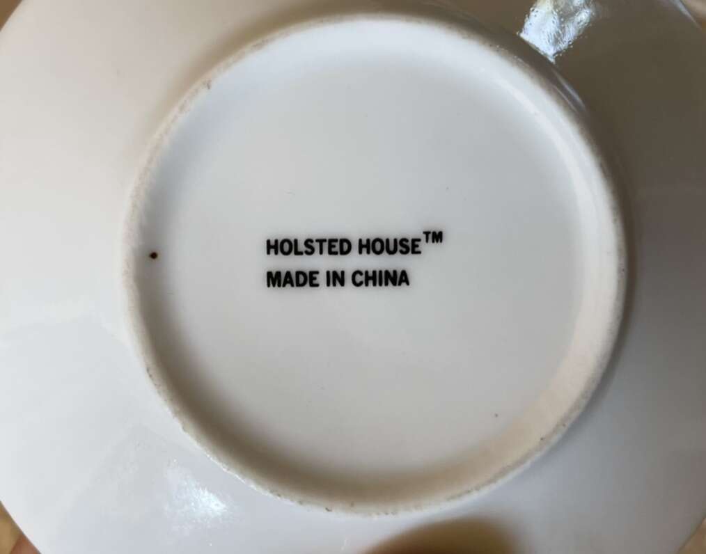 I have a Holsted House demitasse espresso cup and saucer. It is yellow and white with gold. The saucer is about 4 1/4 inches across. See my other ads for jewelry, artwork, home decor and more.