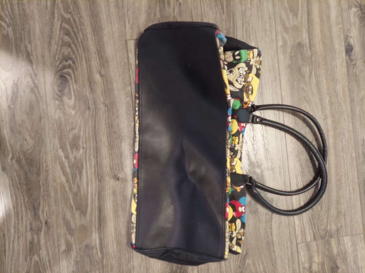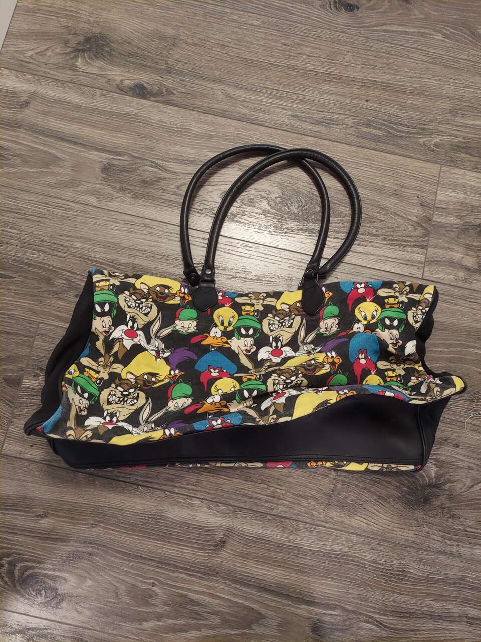 Canvas Looney Tune print duffle bag. Zipper closure. Light weight. Measurements: 20 inches long 12 inches tall 9 inches wide Handles are faux leather with 11 inch drop Smoke free, pet free home.
