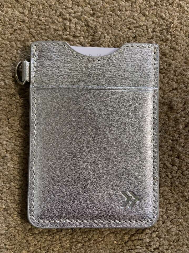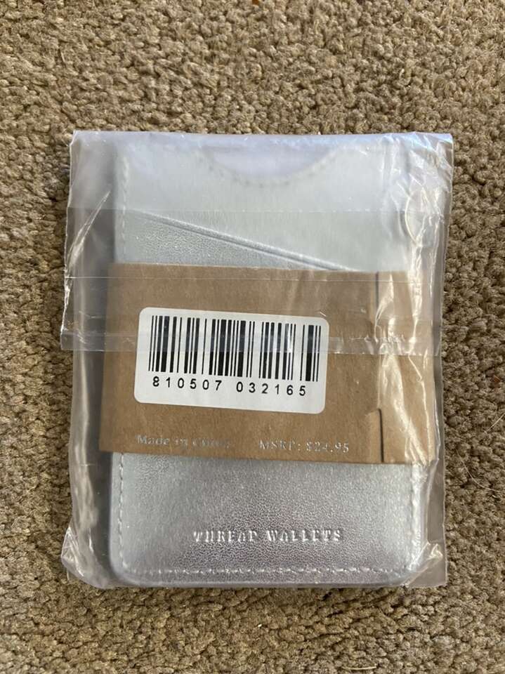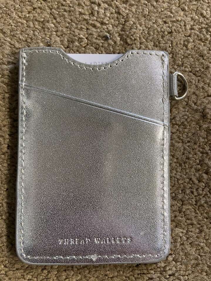 New in the package Thread Wallet silver leather wallet. Great for anyone. Gift ready for birthday, graduation, Mother’s Day, Father’s Day, or just for yourself. Holds credit cards, hotel keys, and cash. Chrome D ring if you want to attach it to lanyard. Leather. Free of defects, non smoking home. Cash or Venmo. Text or message.