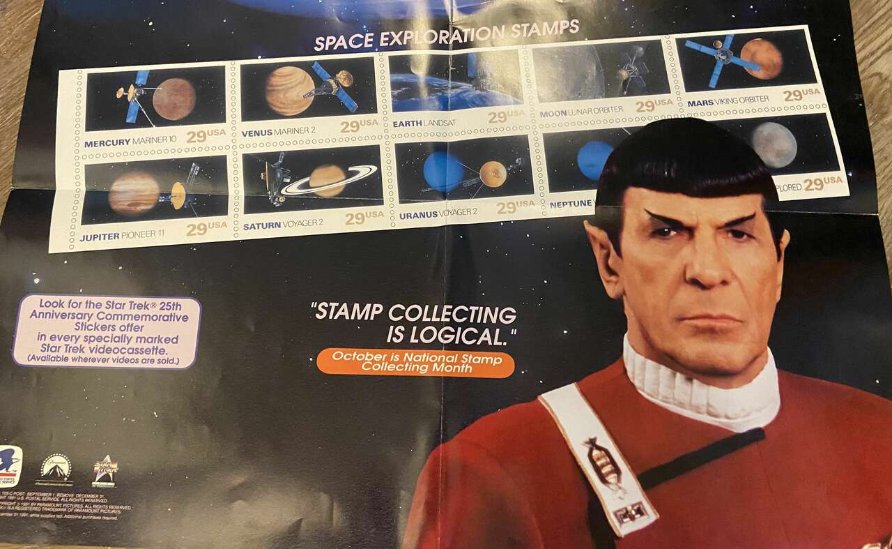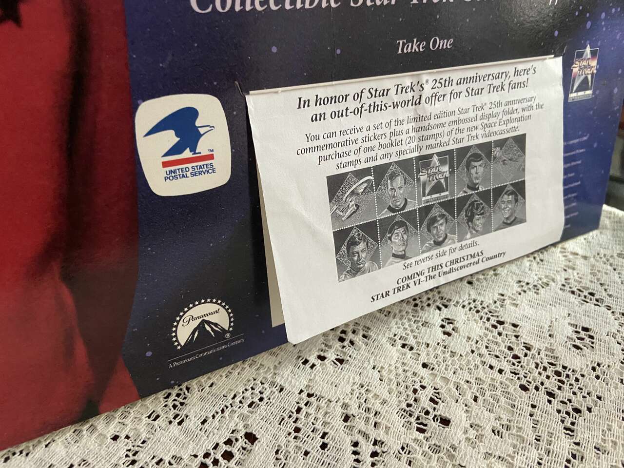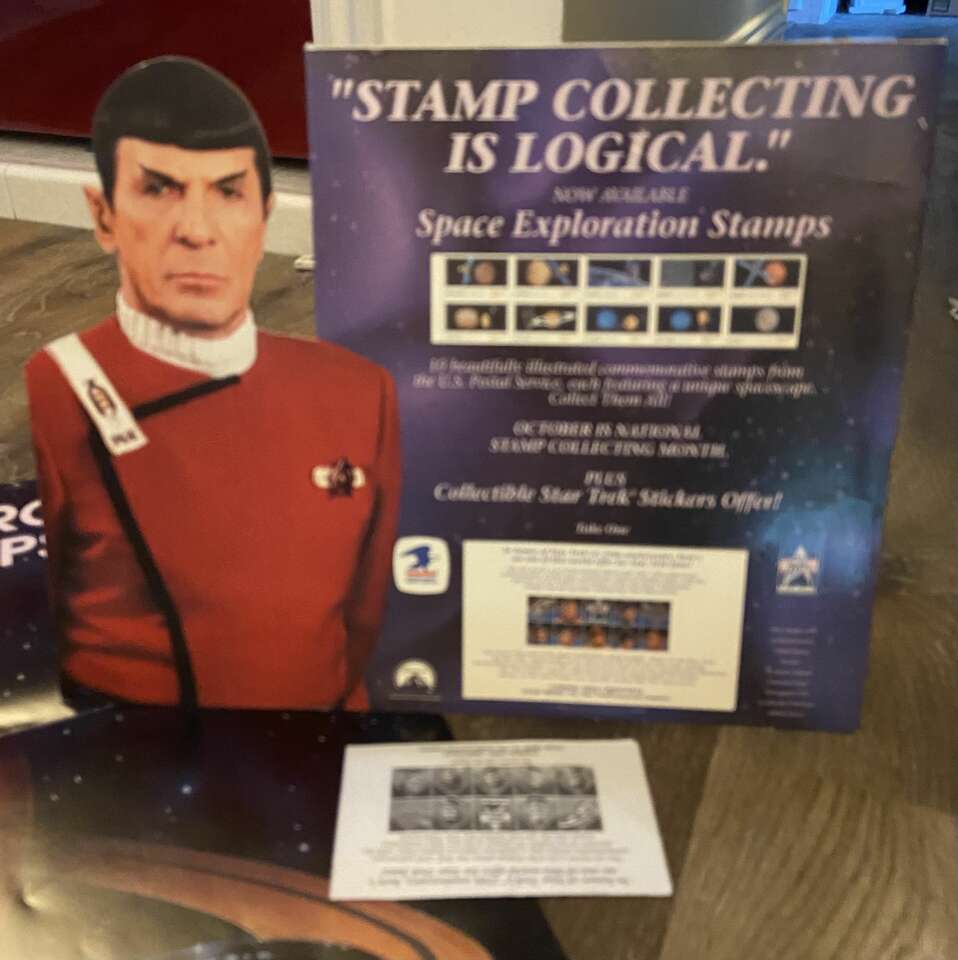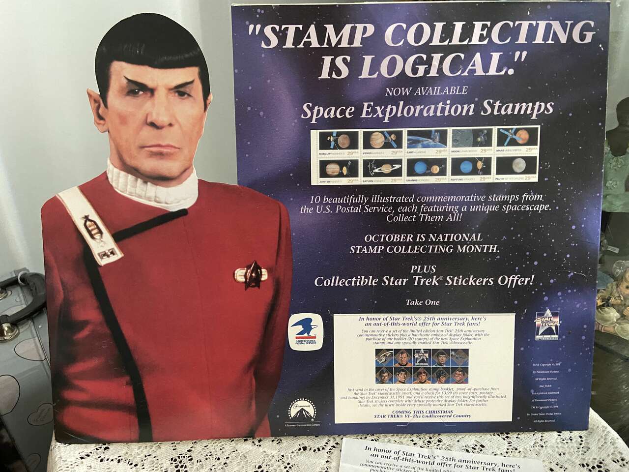ITEM #1-Star Trek Stamp Collecting is Logical Mister Spock Post Office Display Standee. Measures roughly 11 1/2 x 14, and stood on US Post Office Counters. This was part of a Cross Promotional Campaign for the Space Exploration Stamps also released that year. Patrons had to buy the book of Space Exploration Stamps and Star Trek VI The Undiscovered Country. Then with proofs of purchase from both items, and $3.99 Patrons could receive a special Crew Sticker/stamp Set.