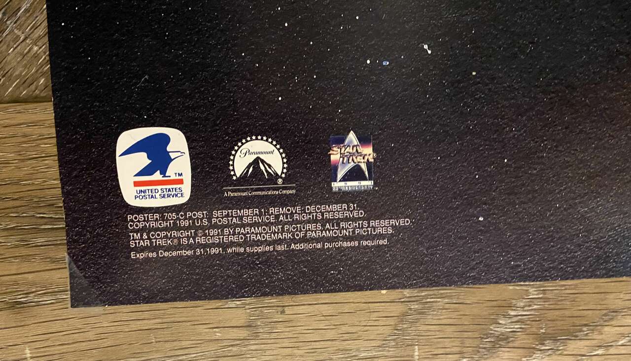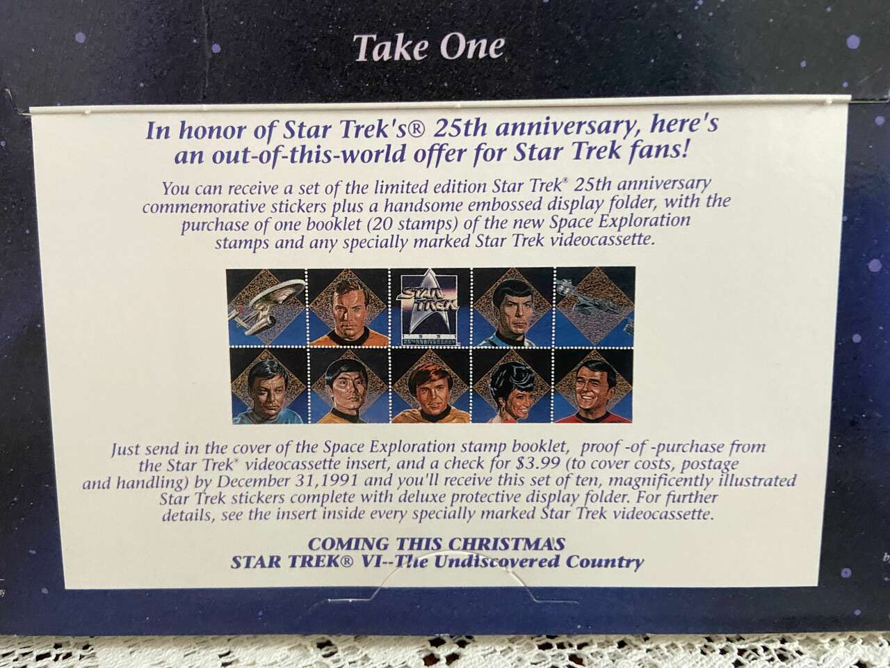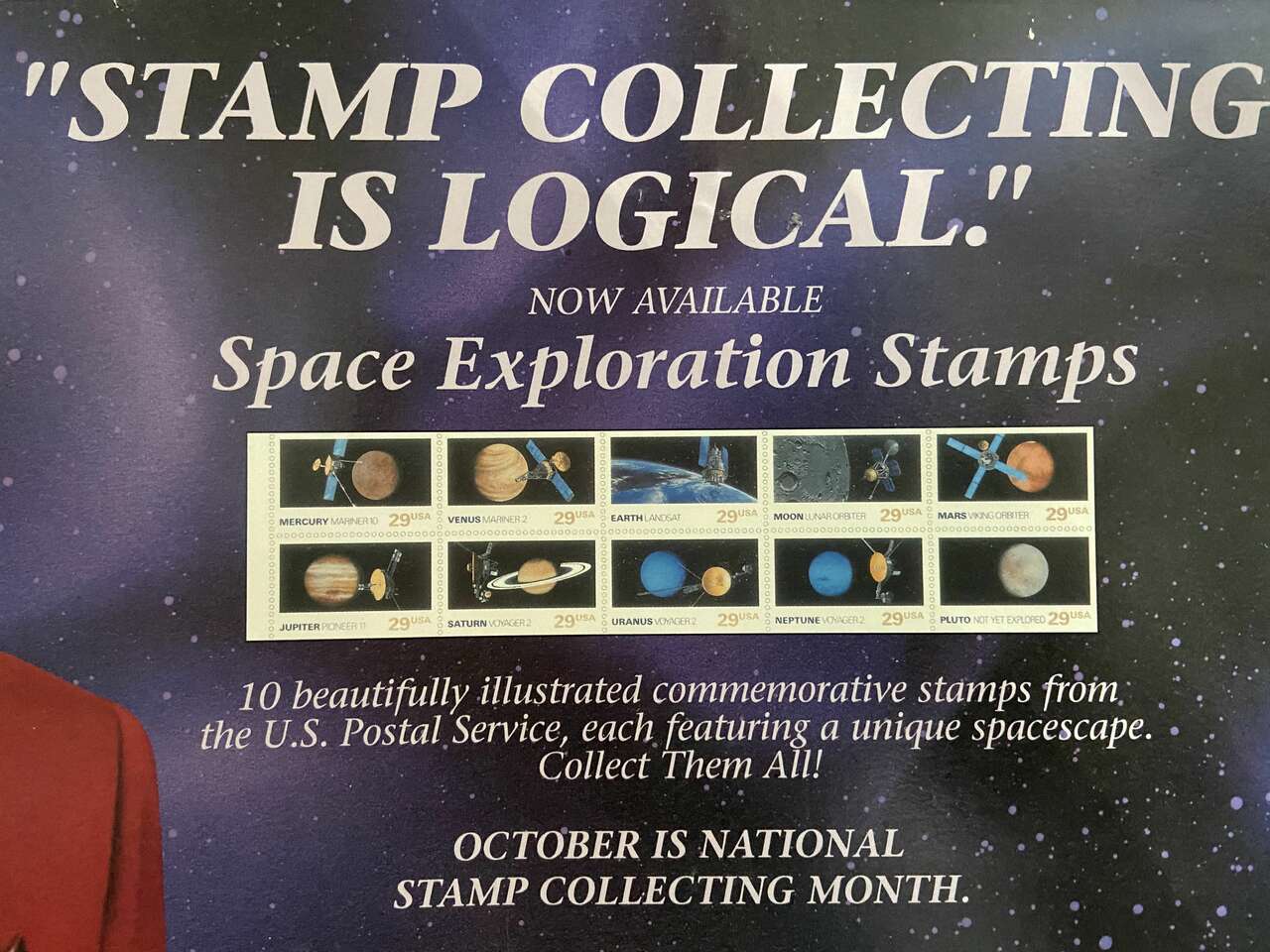 ITEM #2-Journey to a Final Frontier.....Collect Stamps Poster. Vintage 1991 Star Trek stamp collecting poster. Made by the United States Postal Service (USPS) to commemorate the 25th anniversary of Star Trek (and to encourage Star Trek fans to begin collecting postage stamps). This 36" X 21" poster pictures the Enterprise and Mr. Spock (Leonard Nimoy) as both appeared in the 1991 Star Trek film Star Trek VI: The Undiscovered Country. Also pictured are ten "Space Exploration" stamps issued by the USPS. Poster is designed to be displayed behind/over the counter at post offices around the country - it was not sold to the general public, so only a limited number were printed, and most were destroyed at the end of 1991 when the USPS advertising campaign ended. Poster is in near mint/mint condition with no rips, tears, thumbtack holes, or other damage. Poster is folded into four panels, exactly as it was sent to post offices from the USPS. A great addition to any collection of vintage Star Trek items or stamp collecting memorabilia.