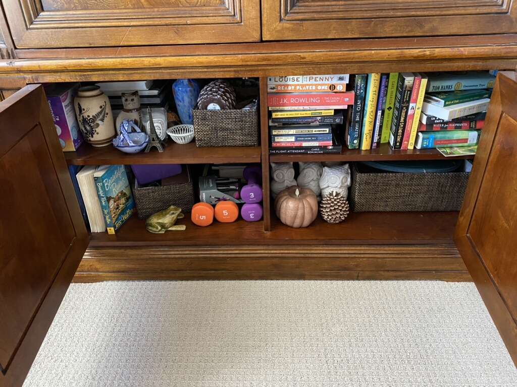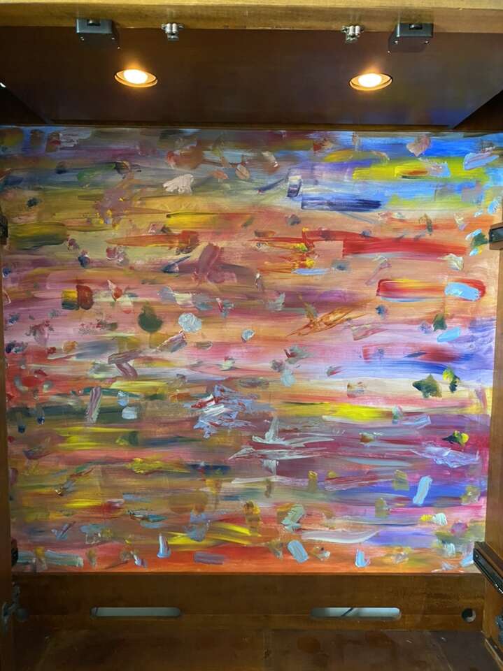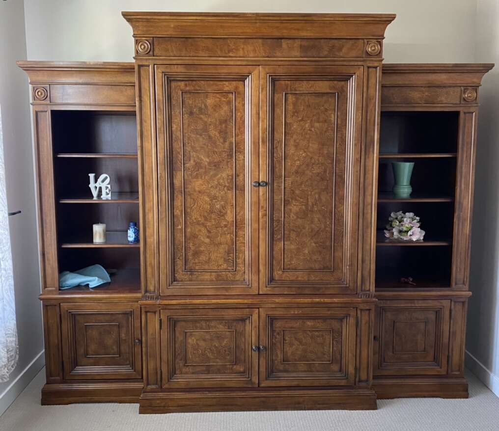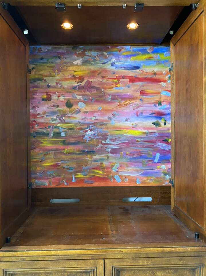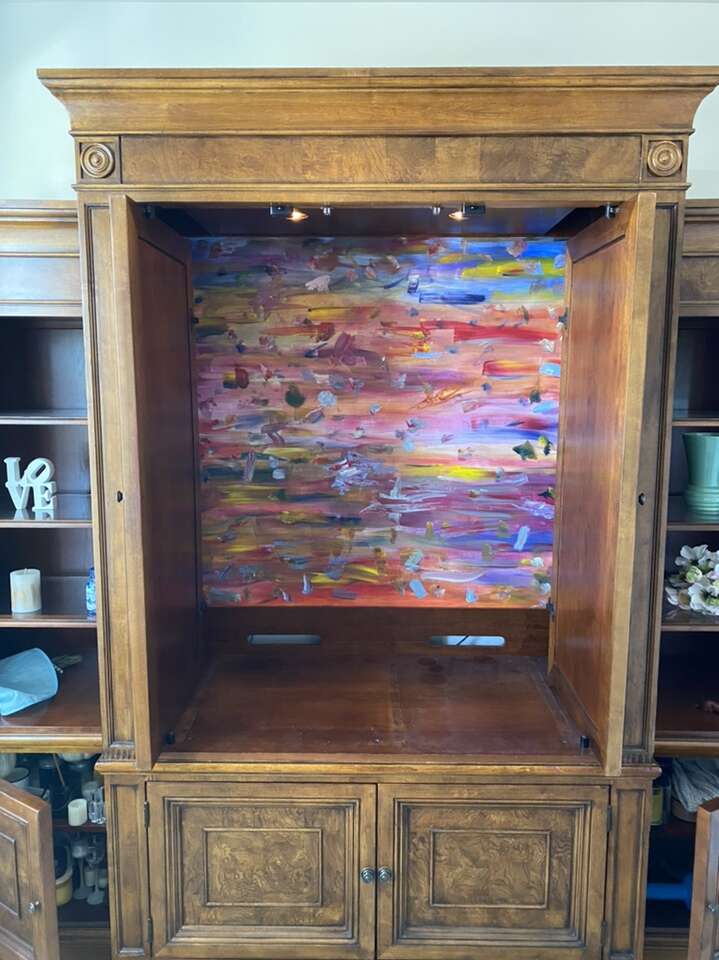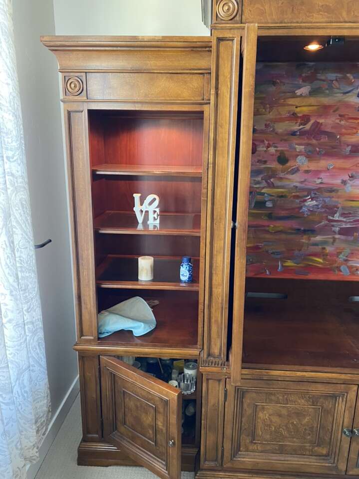 4 piece unit where center can be used separately from side pieces. Custom painting from local artist for backing. Custom lighting. Beveled glass shelving. Extra internal shelving and parts beyond what you see included.