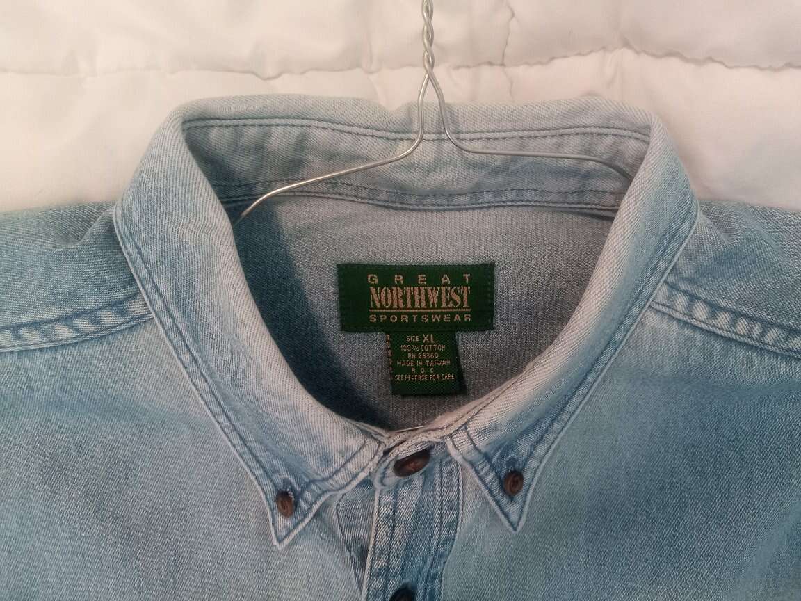 This men's Great Northwest Sportswear XL long sleeve has button down collar and a pocket. I would say it is of a denim or chambray fabric. It has recently returned from the cleaners, after being washed, lightly starched, and pressed. It is from a smoke-free home. Cash or Venmo only.
