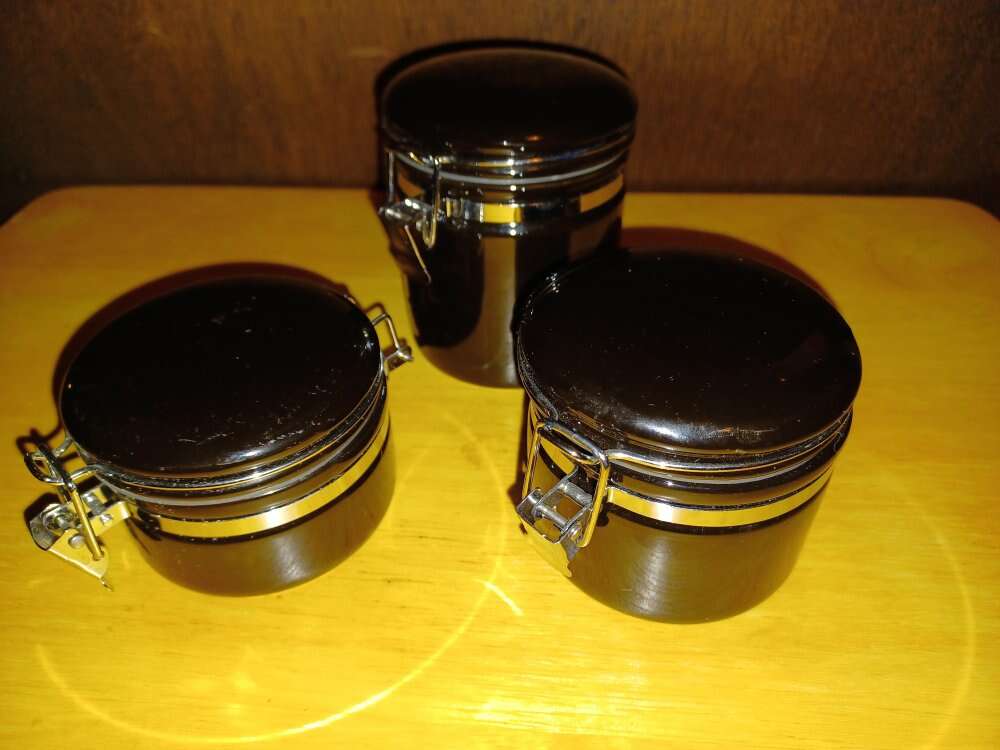 Dark blue ceramic container set Metal clamp closure assure a very air tight seal. Great for jam, jelly, pesto, chutney, apple butter, honey..... 4oz 6oz 8oz