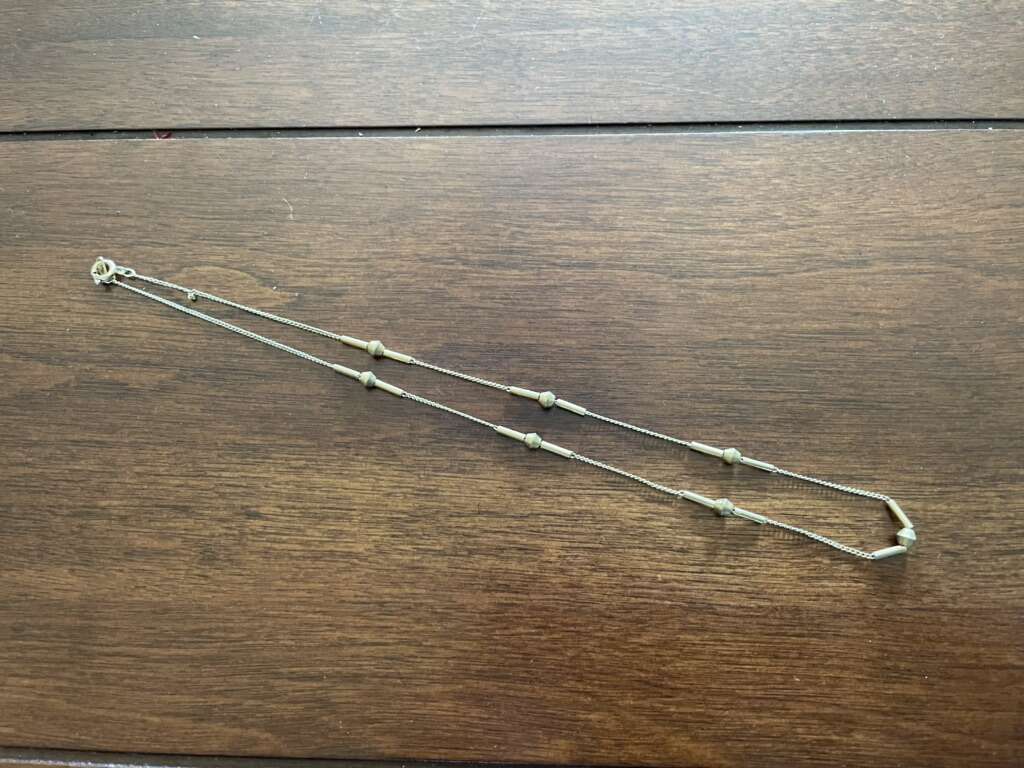 I have a really pretty little vintage necklace that is a darker gold tone. It is only 16 1/4 inches long. There are 7 uniquely shaped beads with straight beads on each side of them. It came from an estate where most items were from the 1940s to 1960s but I don’t know it’s age. See my other ads for jewelry, artwork, home decor and more.