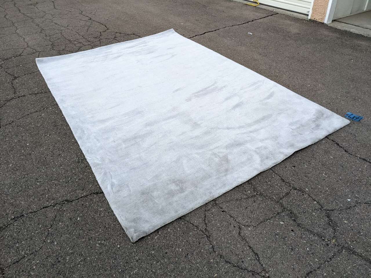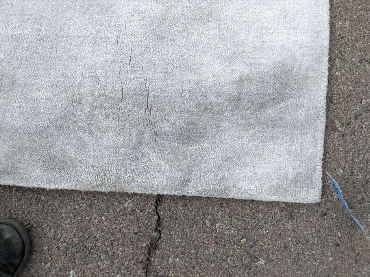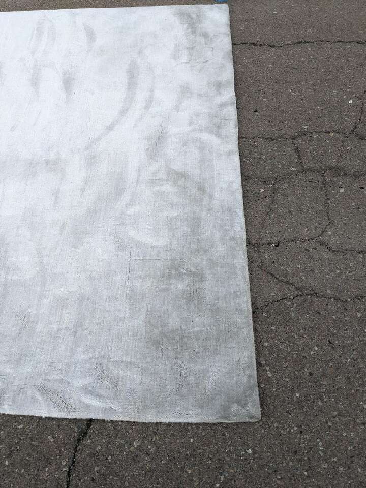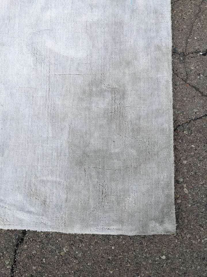 It's a really cool rug in that it has a white appearance with a haze of blue but the way the fibers bend changes the color and also disguises dirt really well. I angled it to show the dirt best I could but the dirt should come out easily. It'll likely outlast a lot of abuse unlike almost any rug this light. If I'm wrong about how easily the dirt will come out, I am happy to adjust the price after the fact.