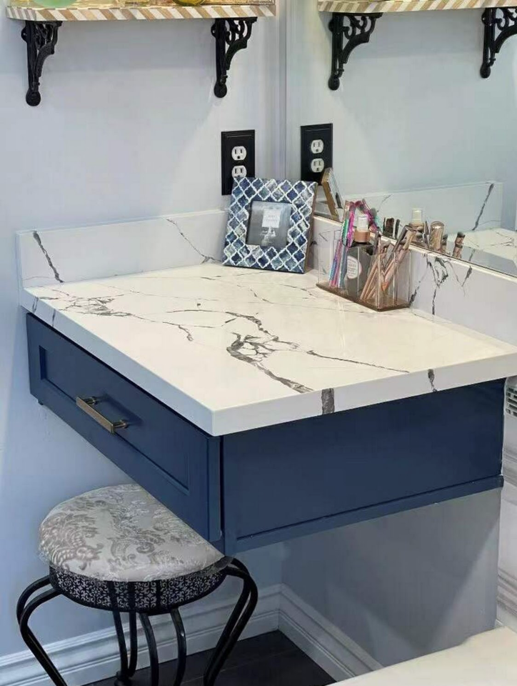Hi, AMC Building Materials sells Bathroom /Kitchen cabinets and countertops. The cabinets' faces, doors, and drawers are solid wood birch, and the box is birch plywood with no particle board. All of the hinges are soft-close and adjustable. We have various designs of Quartz, Marble, and Granite in both prefabricated and raw slabs. Please come to the showroom anytime to explore prices and options. No appointment necessary.