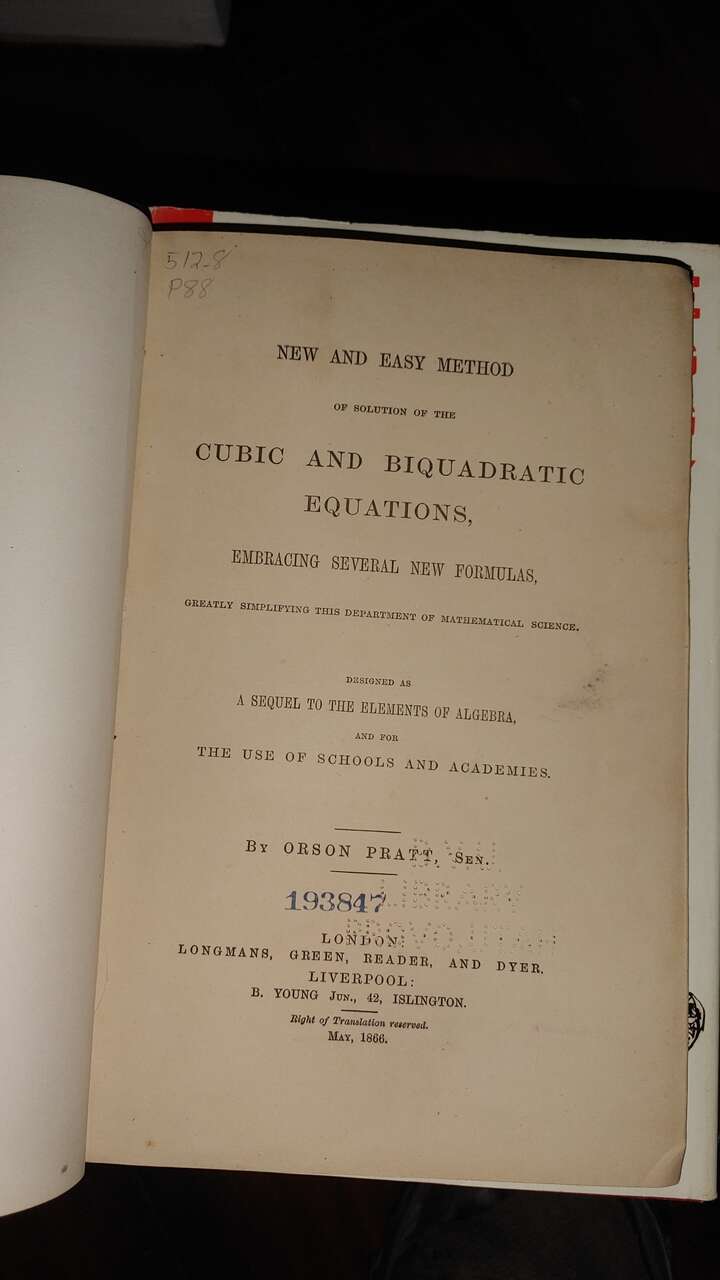 New and easy method of solution of the cubic and biquadratic equations,: Embracing several new formulas, greatly simplifying this department of mathematical science Unknown Binding – January 1, 1866 by Orson Pratt (Author)