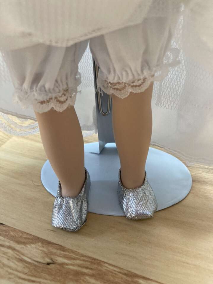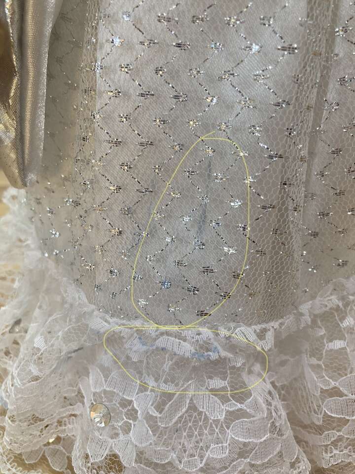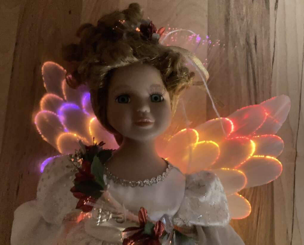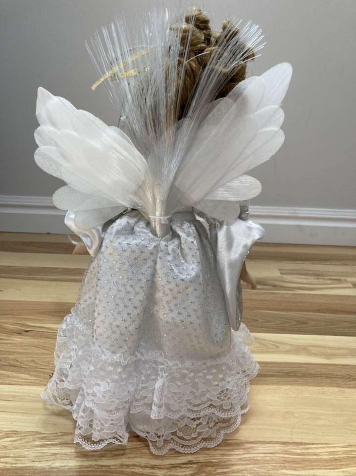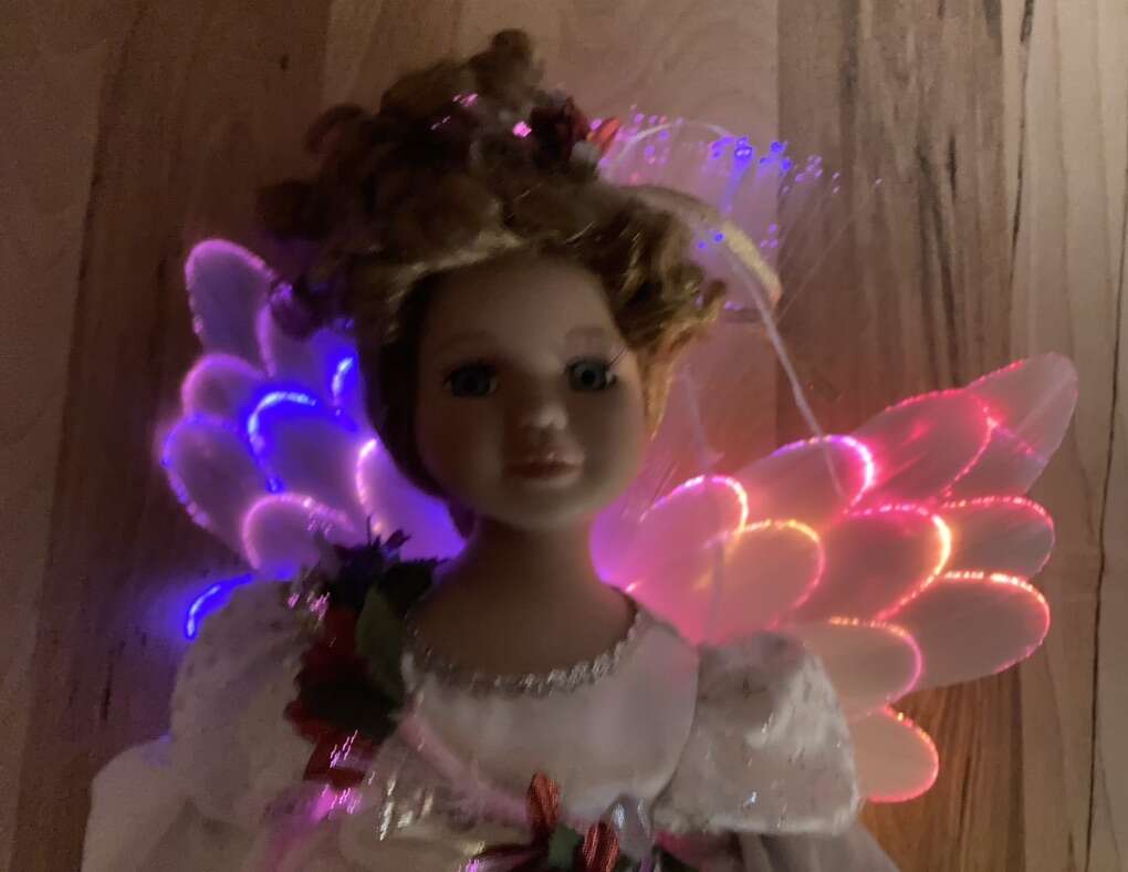 This porcelain doll comes with a white stand. She has a battery pack under the dress that powers beautiful fiber optic wings. (See photos.) One of the wing pieces on the right side has a fold in it (see photo)- it still sits pretty flat, but it affects the fiber optics a little bit. The flowers on the chest and at her hand also have fiber optics. She has a few blue stains on the lace overdress and the satin underdress that I think are fairly unnoticeable. (See photo.) Texts preferred. :)