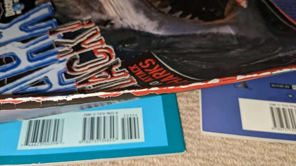 There is some wear on the spine of the discovery one, and some bends on the terrifying shark tales book.