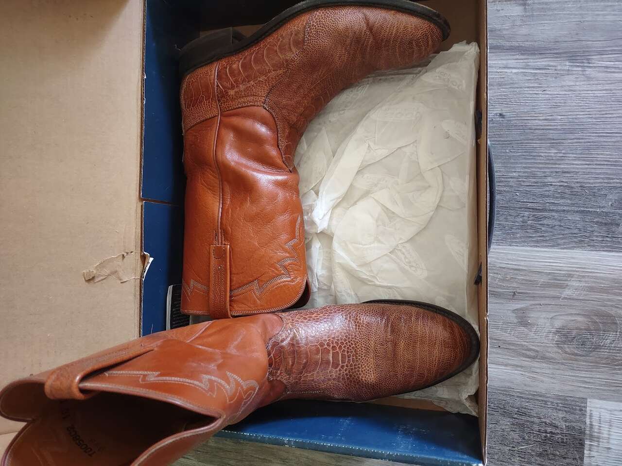This boots are in excellant condition. I have worn them a few times but they have always been stored in the box. These ar L2 Roper Cognac Ostrich Shoulder. they are size 9.5 D. these are in NEW LIKE condition. They were always a bit tight, so I did not wear them much. Now with age my feet have changed size and I cannot even attemp to wear them.