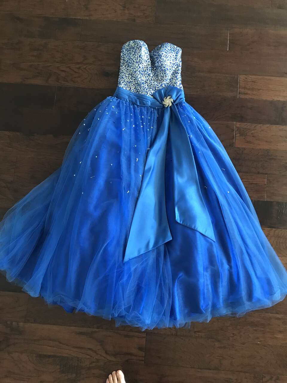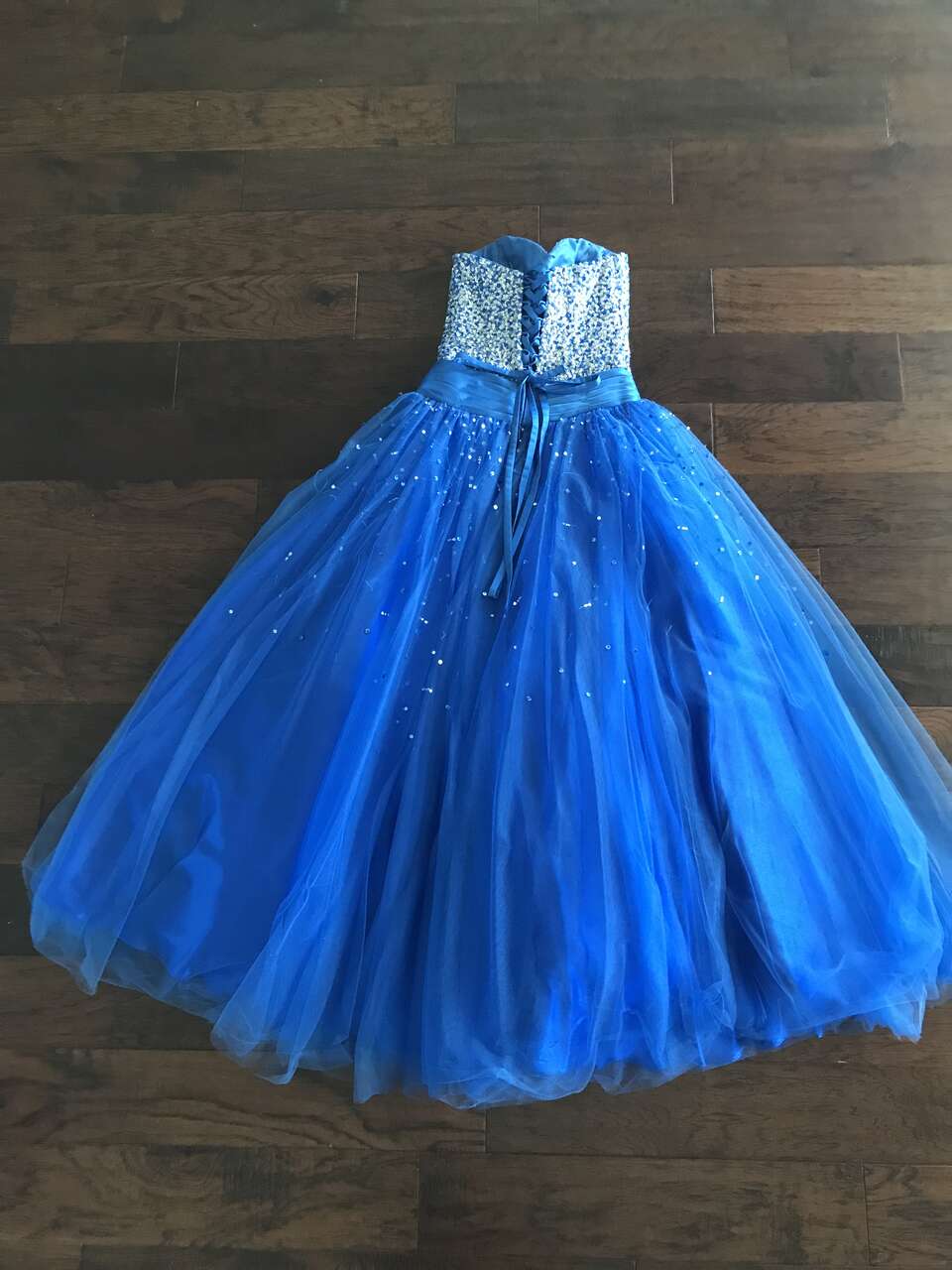 This gorgeous dress is size medium/6. It was only worn one time for a prom. I paid $350.00 for it. It is in excellent condition.