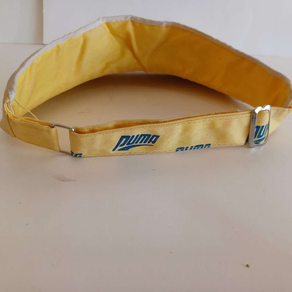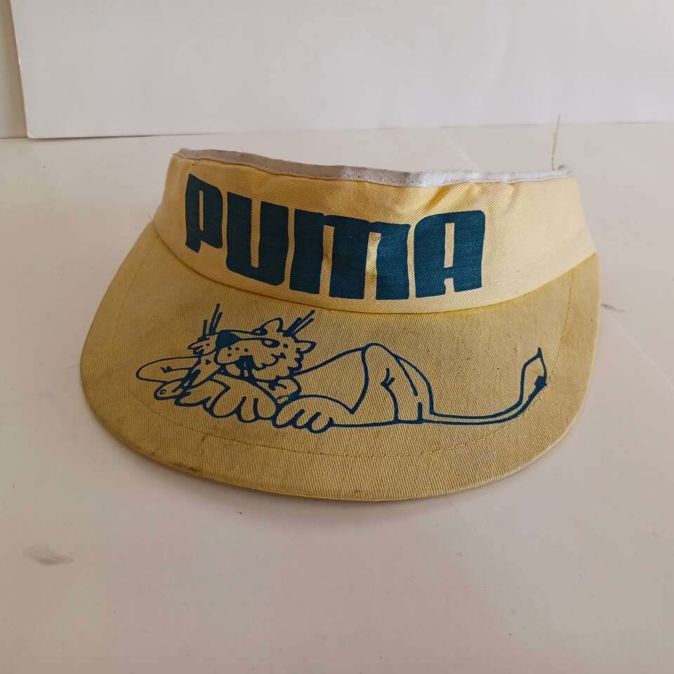 VenmoVintage Puma Large Cat Logo Visor Set Yellow White Tennis OG style. Have not seen any other Puma Visor's like it. From the 70's. Both need a good cleaning. The white one more. White has some stains. Great for collector or costume!