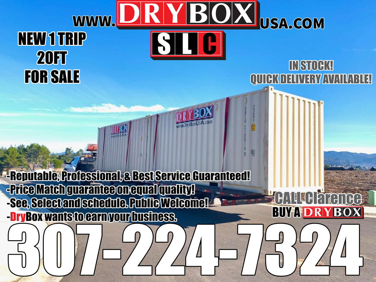 Call Clarence today 307-224-7324 or our Office @ 801-505-0002 for a no pressure quote or to get your container scheduled for delivery Visa, Mastercard, Discover and American Express accepted here. see all of our options at www.dryboxusa.com