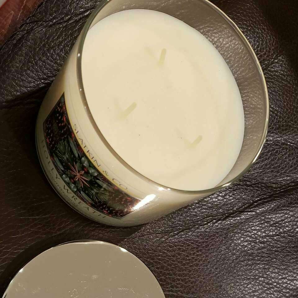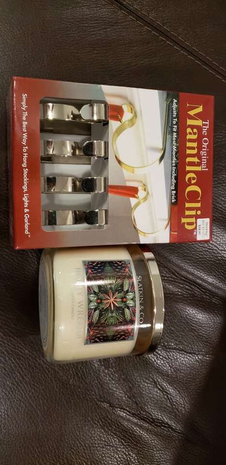 NEW 4 set Mantle clips and Holly Wreath 3 wick sented candle. Sold together. Cash only. FCFS. No holds.