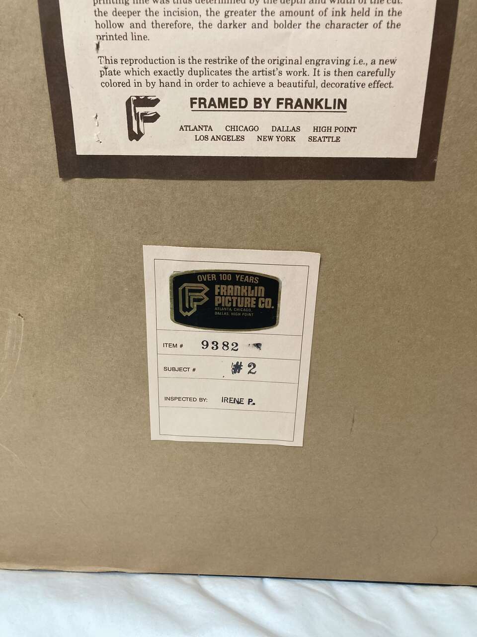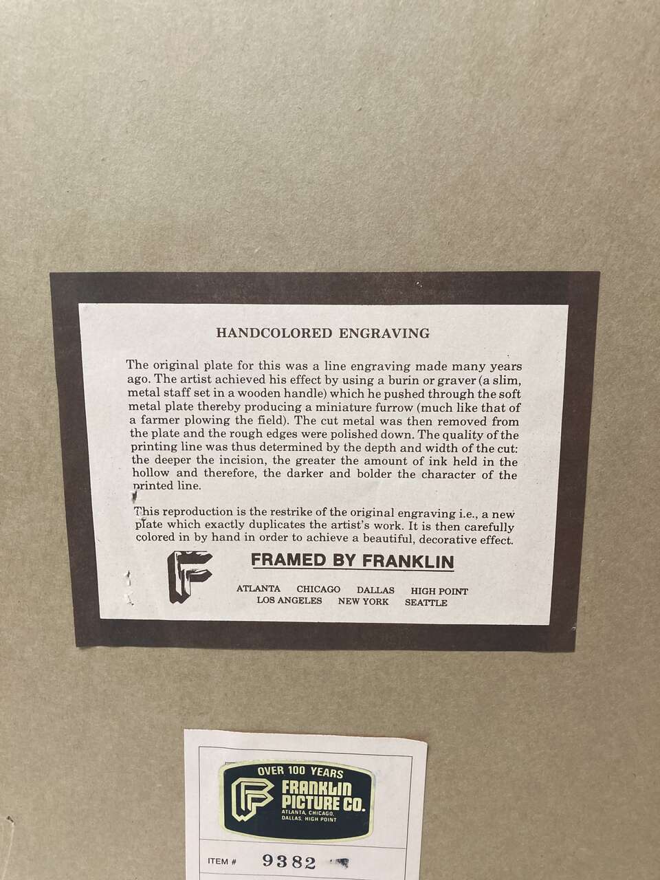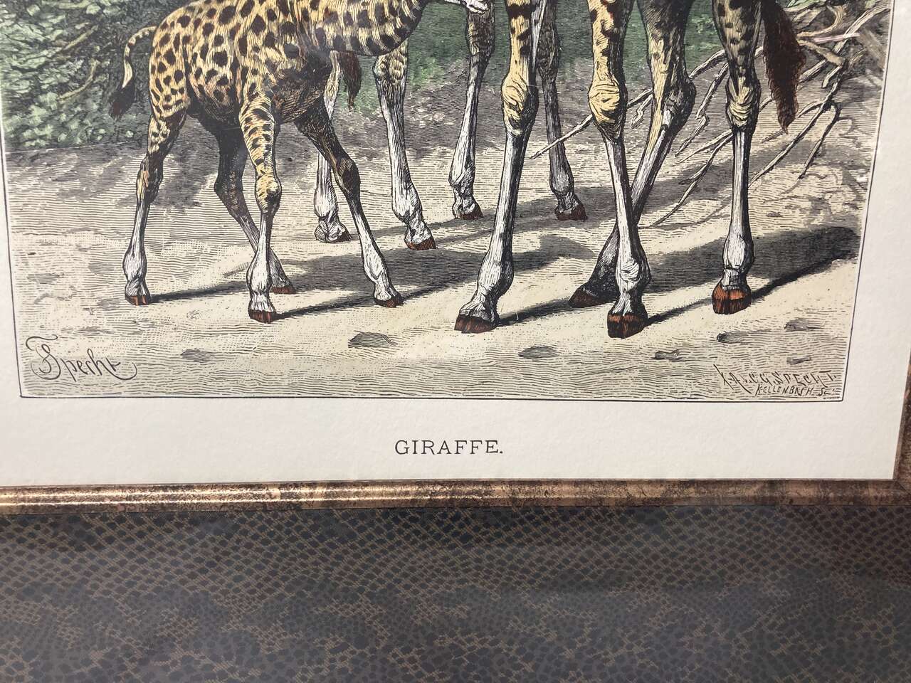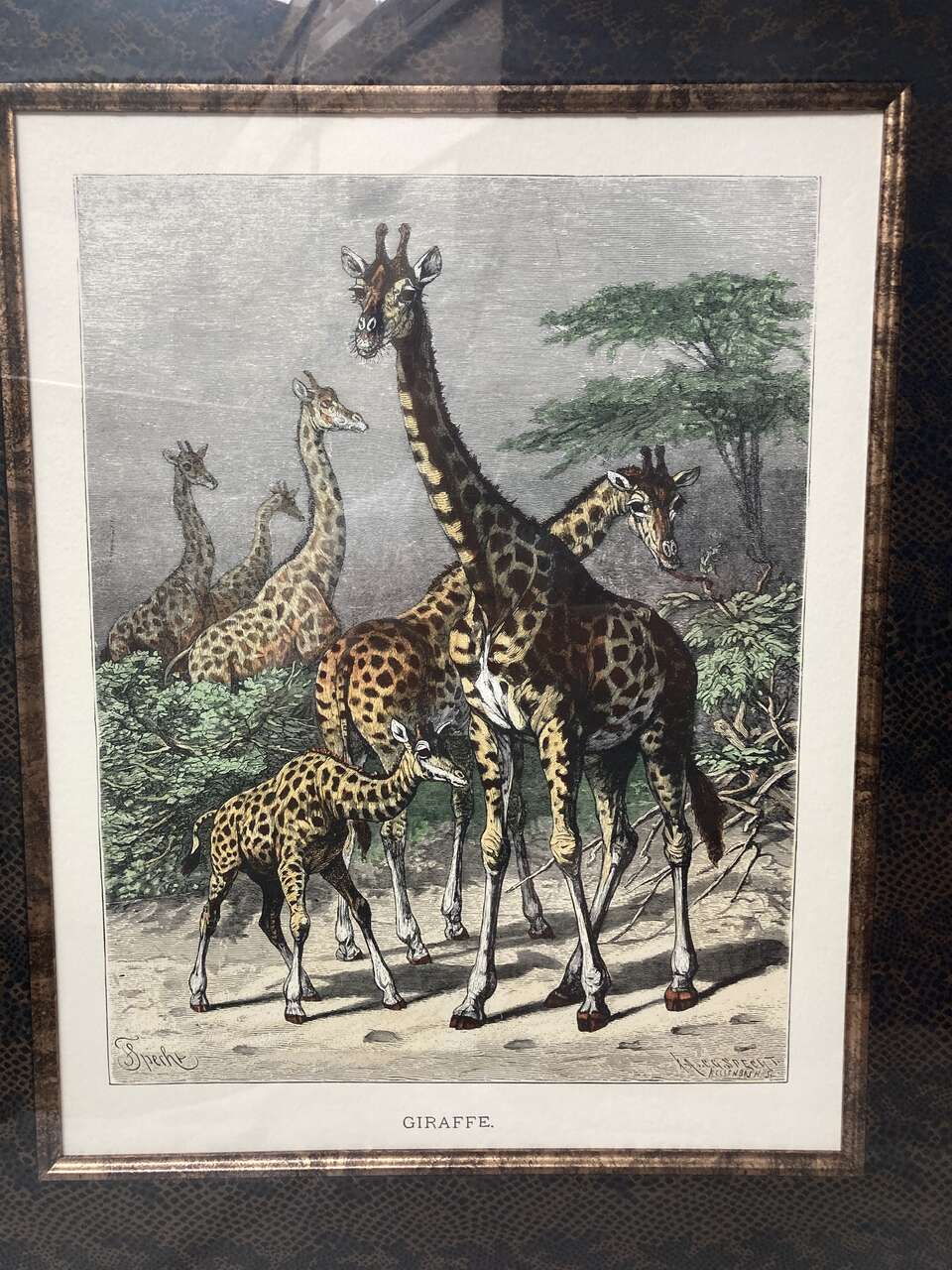 PayPalUp for consideration today is this Franklin Picture Company hand-colored engraving framed of an giraffe. The framed measurements are 32 1/2" by 28 1/2" and the print is 18 1/2" by 14 1/2" it is covered with glass and the frame has normal wear and tear. It has been stored for several years and it is solid and sturdy with minor cosmetic imperfections consistent with age. It comes from a smoke and pet-free home.
