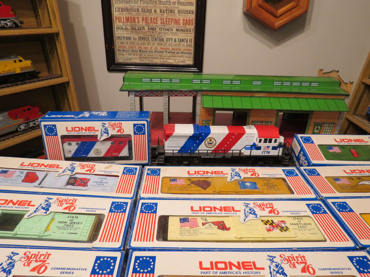 PayPalLionel 1976 "Spirit of 76" complete 15 pc.Train Set made 1975-1977 with original factory boxes . U36B engine has rare white side lettering "Seaboard Coast Line" on engine frames, caboose with red side lanterns & very bight colorful historical graphics on each of the 13 first colony cars. Background items/buildings are not included in this sale.