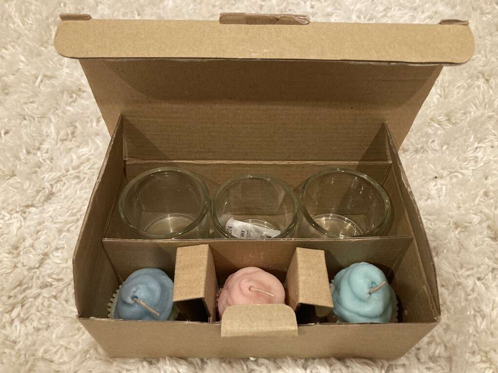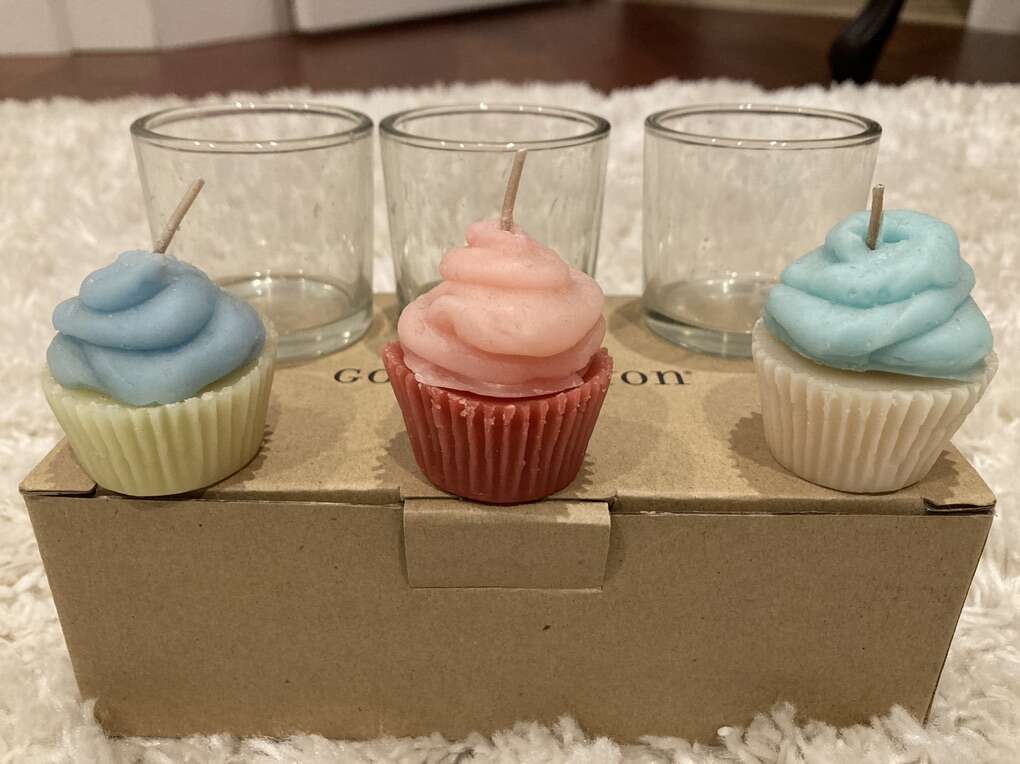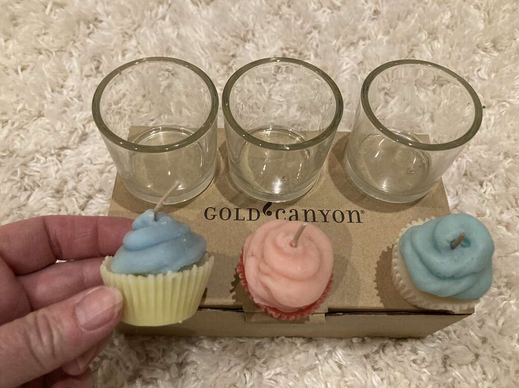Set of 3 darling mini cupcake candles and glass holders. About 2” tall.