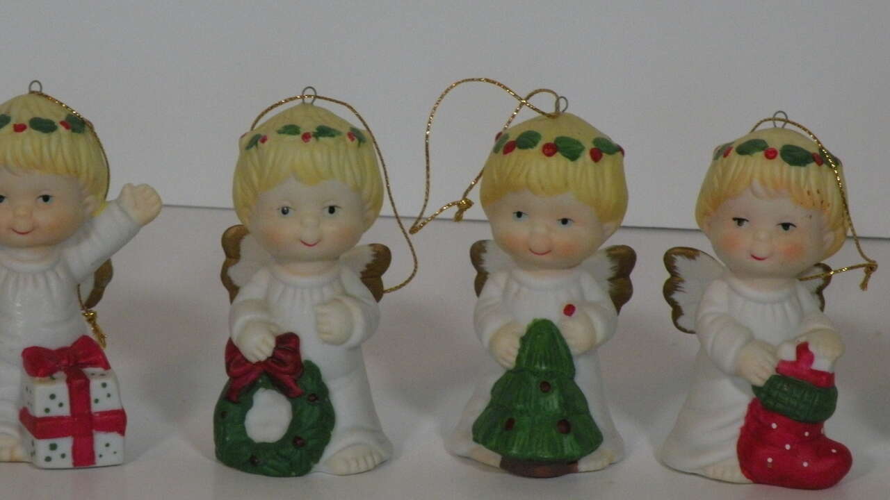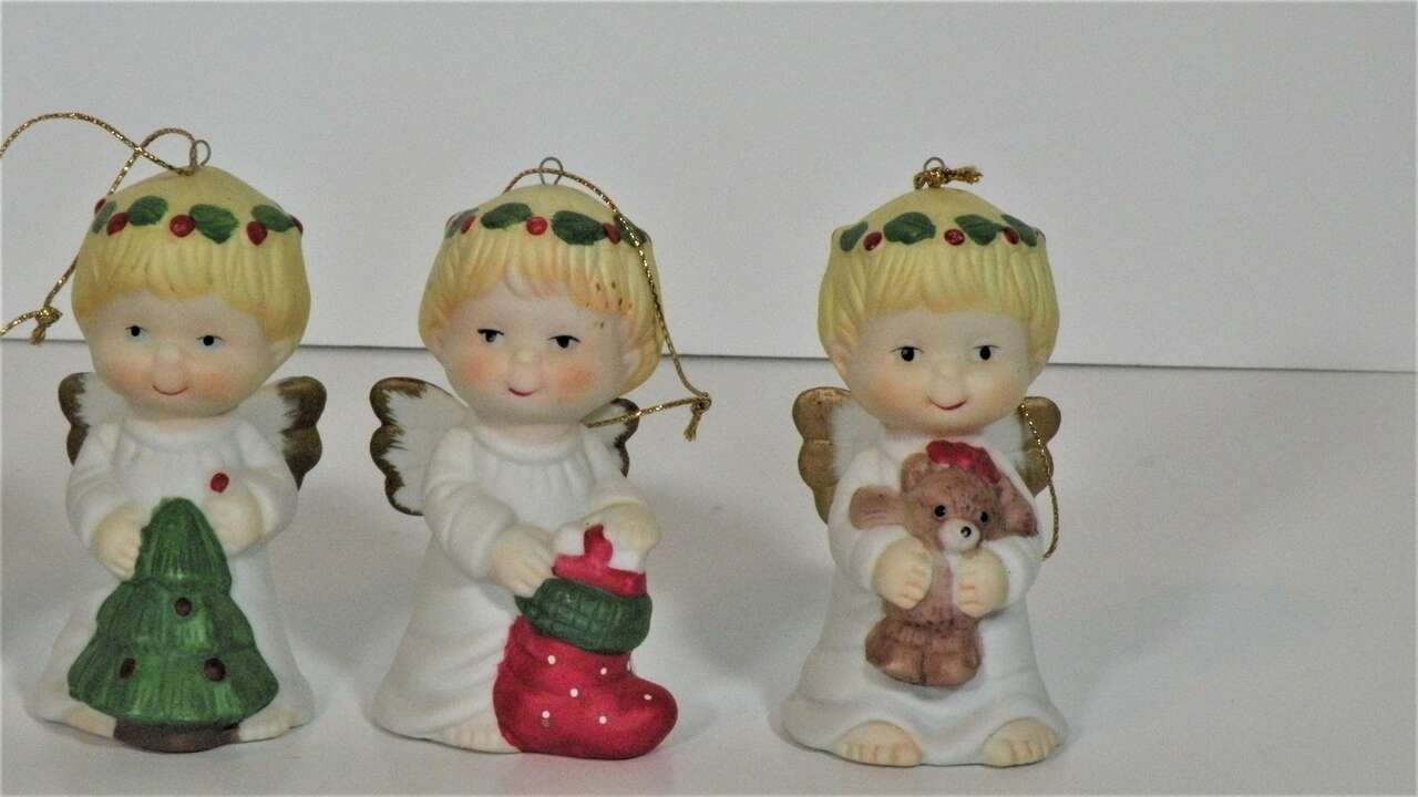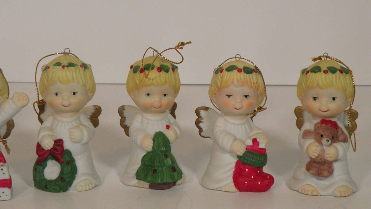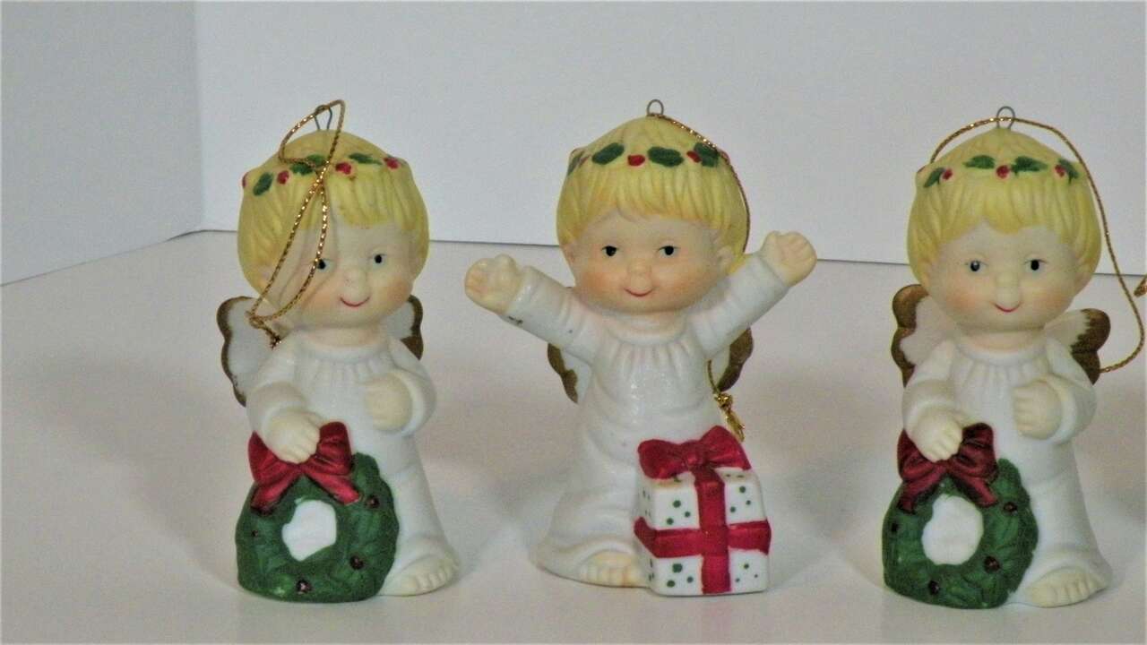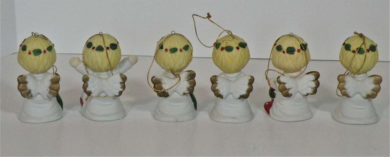Vintage Ceramic Porcelain Ornaments Angels holding various Christmas Decorations. From the 1960"s made in Taiwan. Each one individually hand painted. There are 6 angel girls with various Christmas Items. Wreath, Tree, Present Teddy Bear, and Stocking. These are absolutely the cutest ornaments I've ever seen. These were not used on a tree just in a curio on display. I think my brother brought them back from Taiwan in the 60"s.A great addition to any collection or for decorating a tree or just for setting out at Christmas. They have the cutest faces,and they are all very colorful and have wings trimmed in gold color. “used mothers' collection. probably 1960"s. In excellent condition no chips string attached ”.