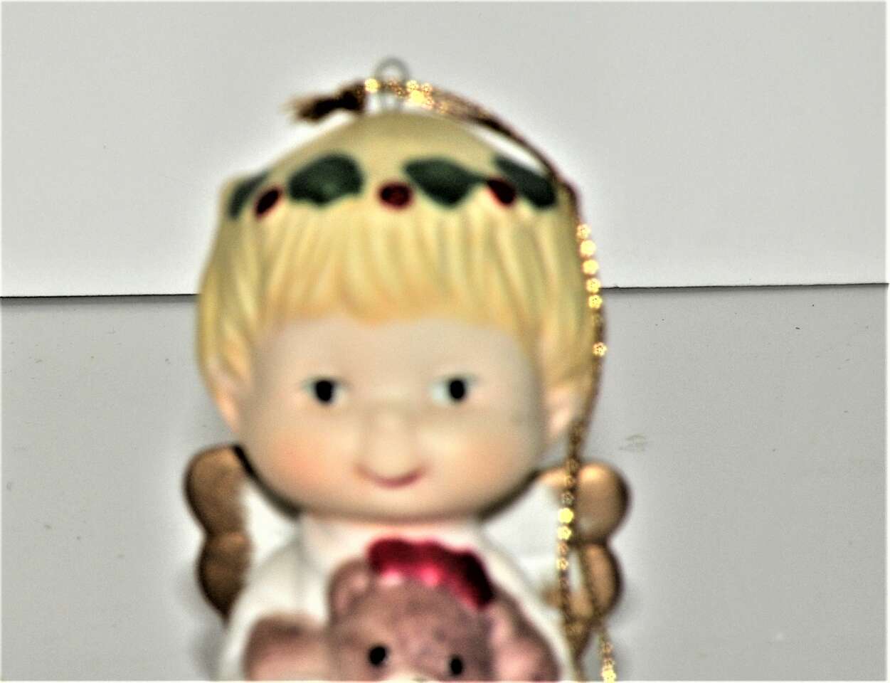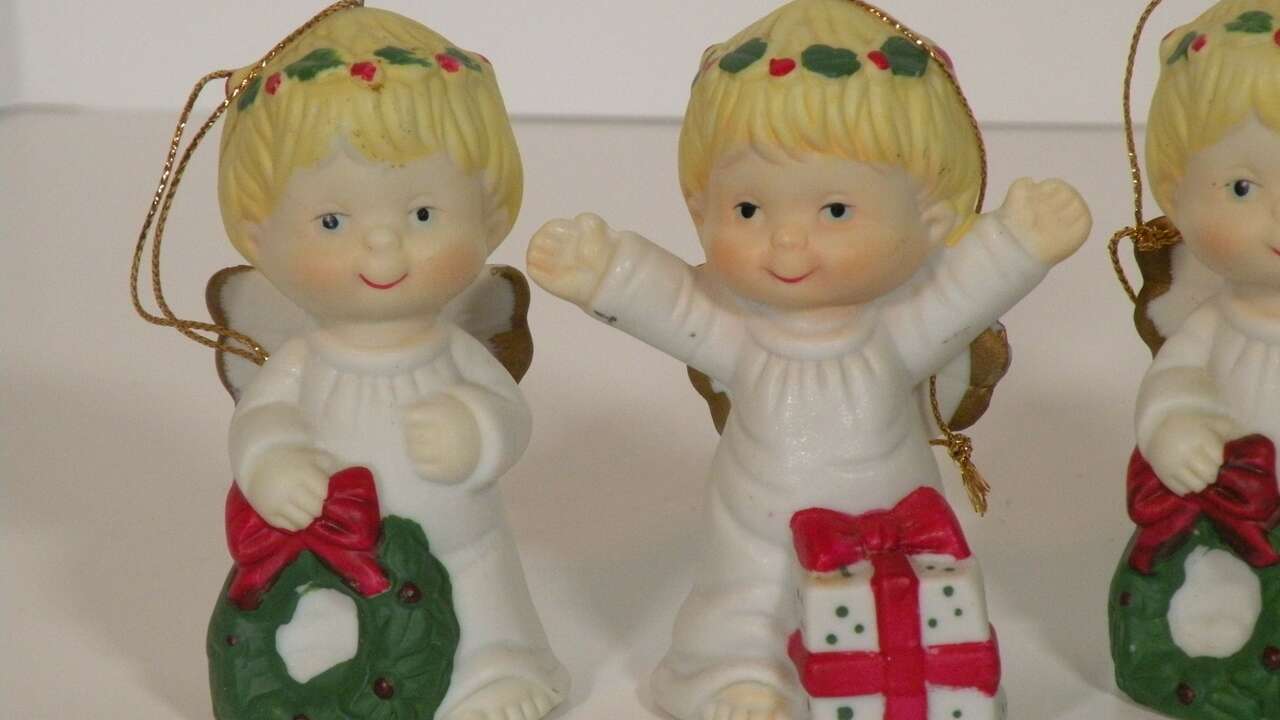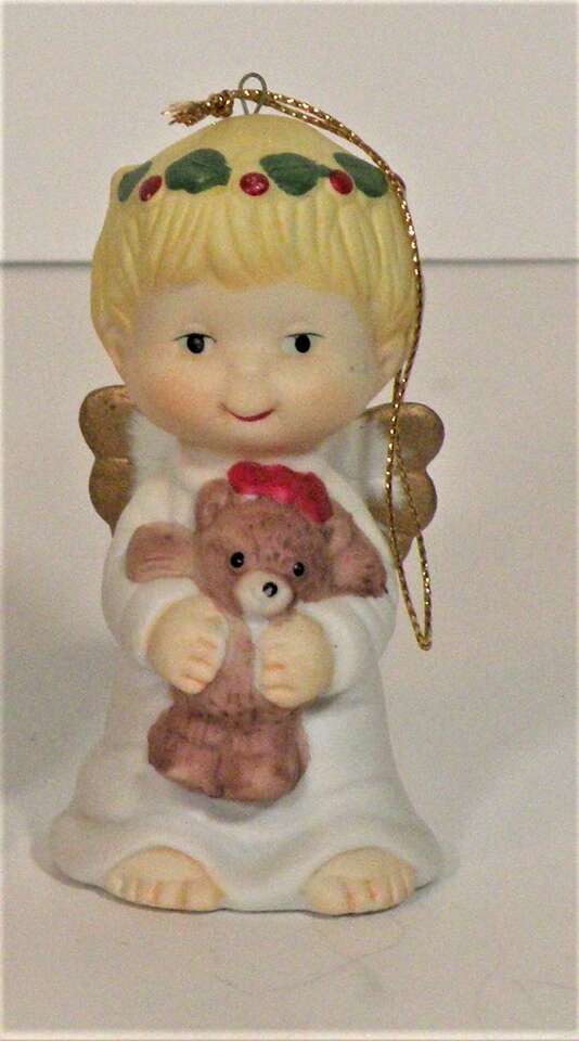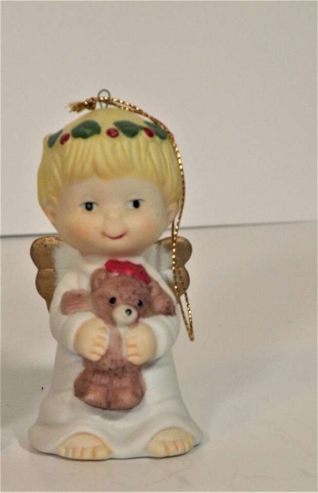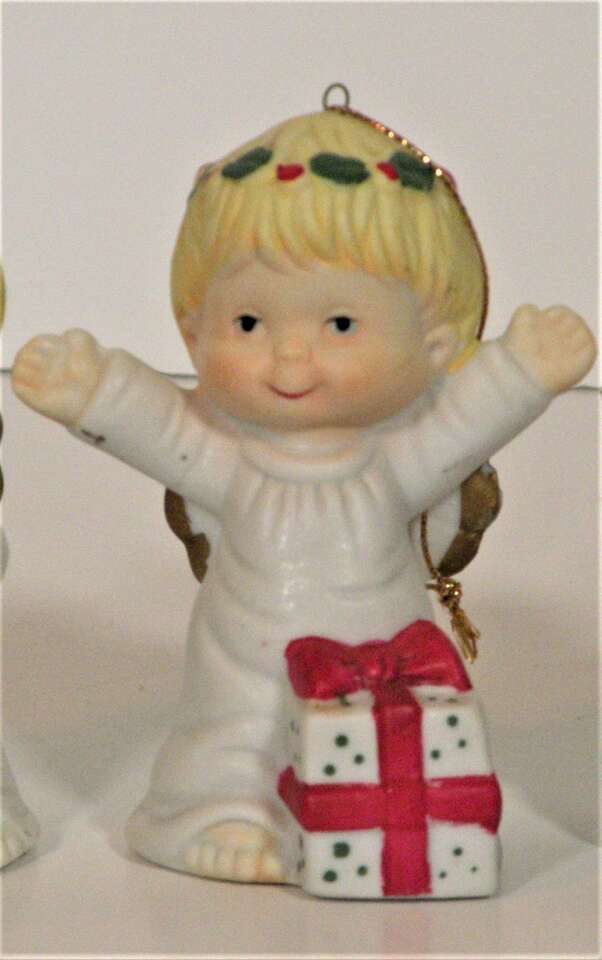 Vintage Ceramic Porcelain Ornaments Angels holding various Christmas Decorations. From the 1960"s made in Taiwan. Each one individually hand painted. There are 6 angel girls with various Christmas Items. Wreath, Tree, Present Teddy Bear, and Stocking. These are absolutely the cutest ornaments I've ever seen. These were not used on a tree just in a curio on display. I think my brother brought them back from Taiwan in the 60"s.A great addition to any collection or for decorating a tree or just for setting out at Christmas. They have the cutest faces,and they are all very colorful and have wings trimmed in gold color. “used mothers' collection. probably 1960"s. In excellent condition no chips string attached ”.