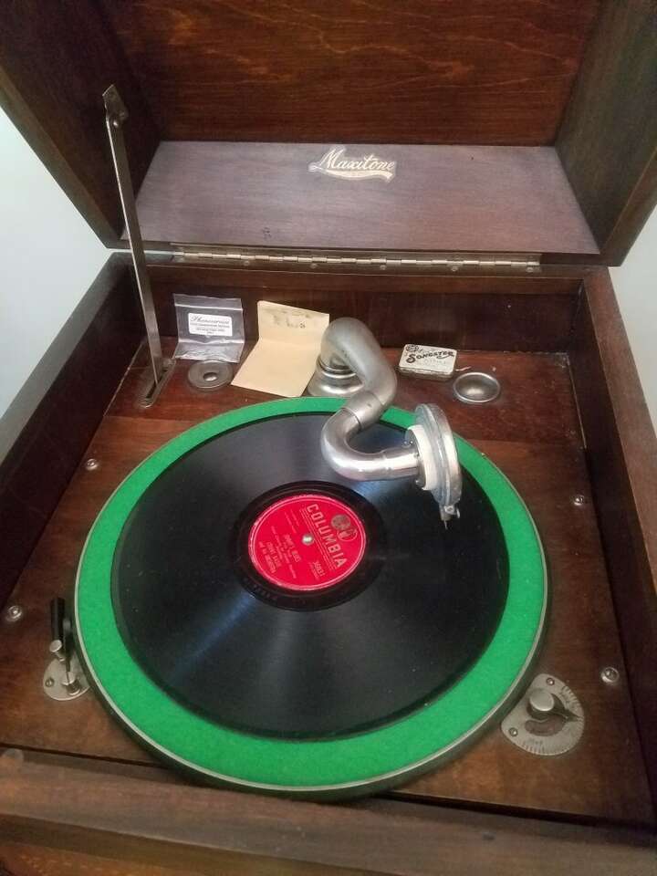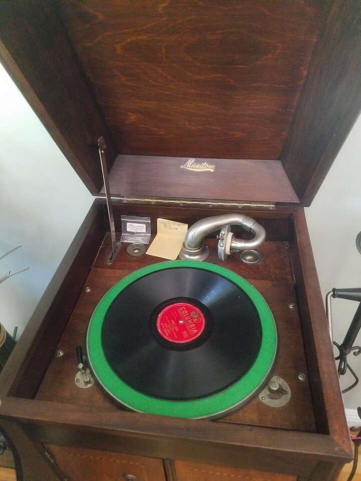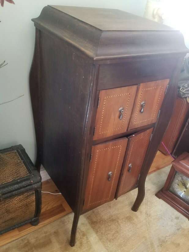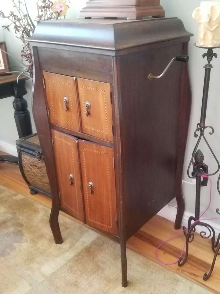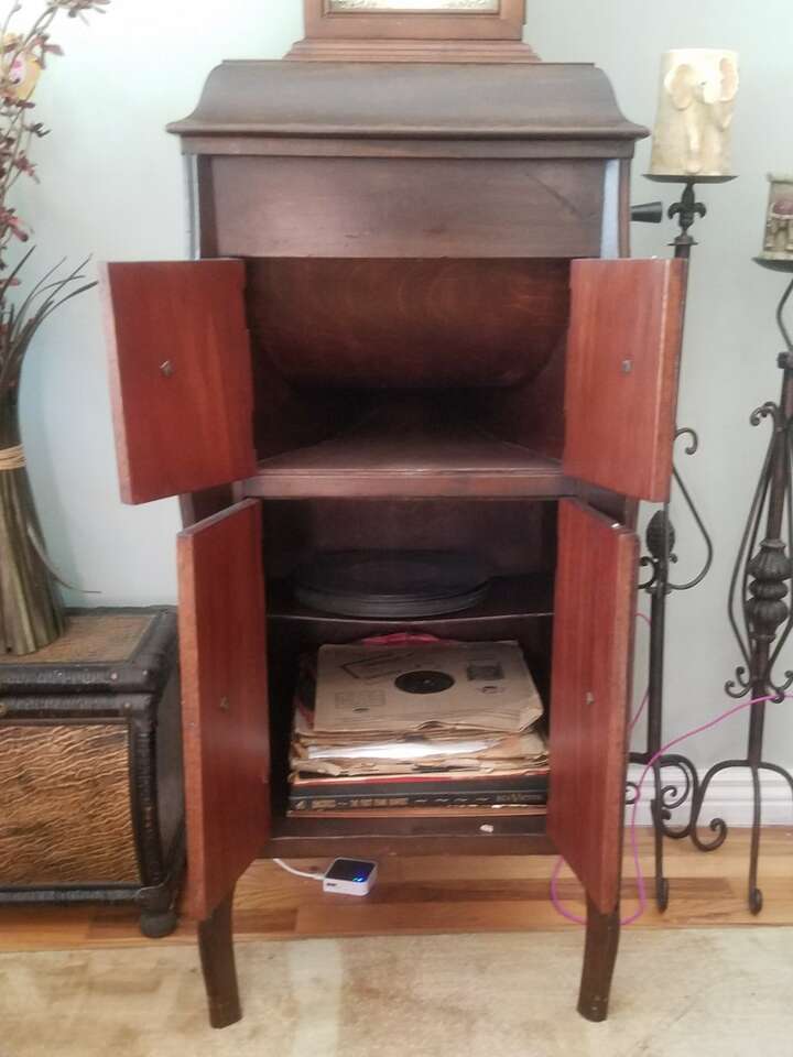 Antique oak gramophone in cabinet. Dating from 1920-30. Oak cabinet with lift up top. Chrome fittings, 4 doors to the front with ornate brass handles. Plays speed Fast 86-70 Slow Offered in very good clean working order. Plays very well. Lovely clean oak case. No breaks or repairs. No woodworm. Stands 19 wide, 20.5 deep & 39 high.