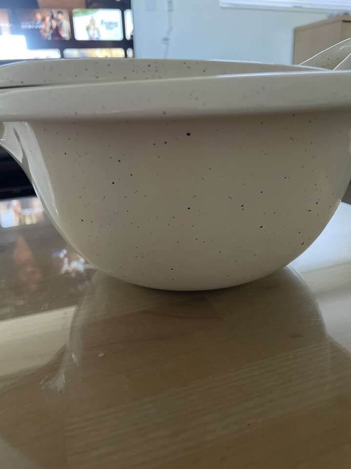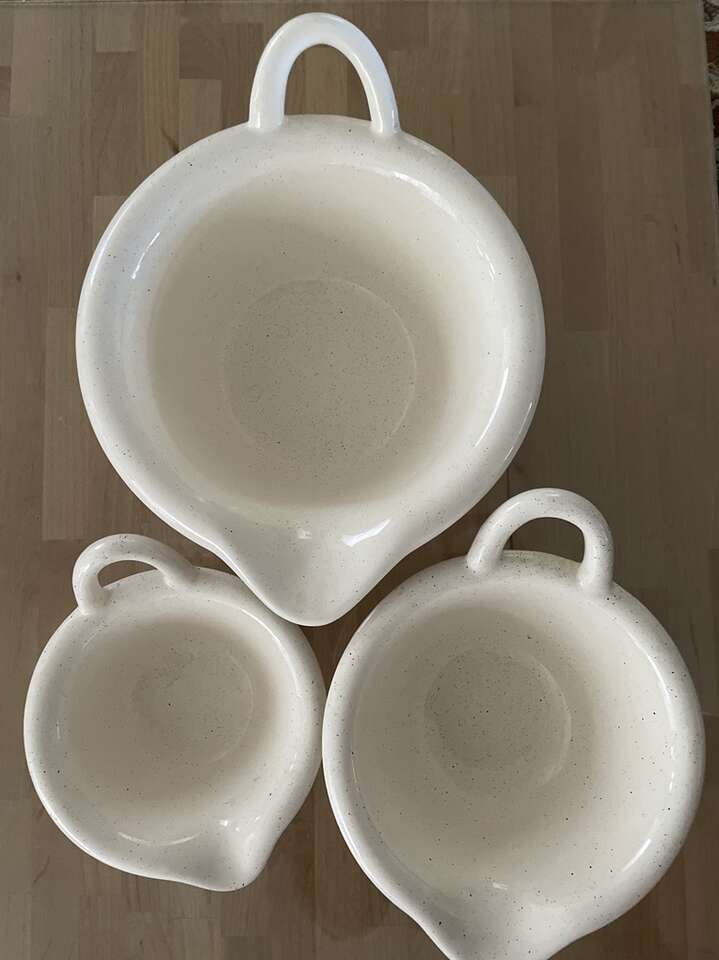 Set of 3 nesting mixing bowls. No chips or cracks. They are in like new condition. Off white creamy with flex’s of grayish black. Bowls are ceramic. Largest bowl is 10.5” x 4.5”, medium is 8.75” x 4”, and small is 7” x 3.25”.