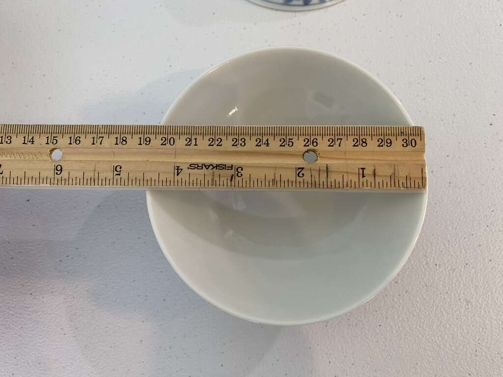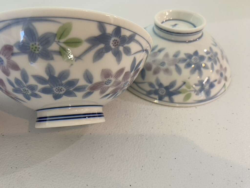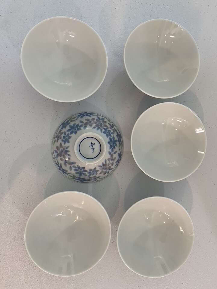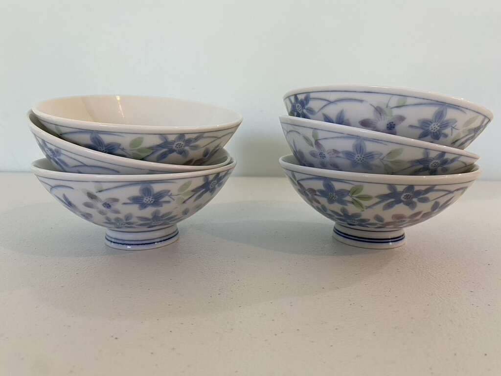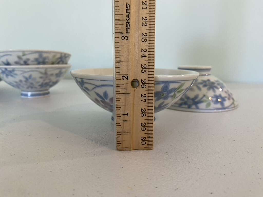 6 beautiful porcelain bowl with a blue, purple and green floral painted pattern. 2 tall and 4.5 wide.