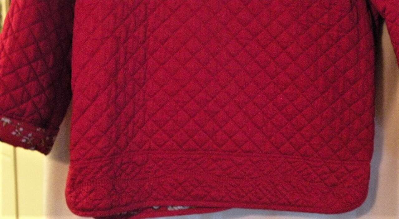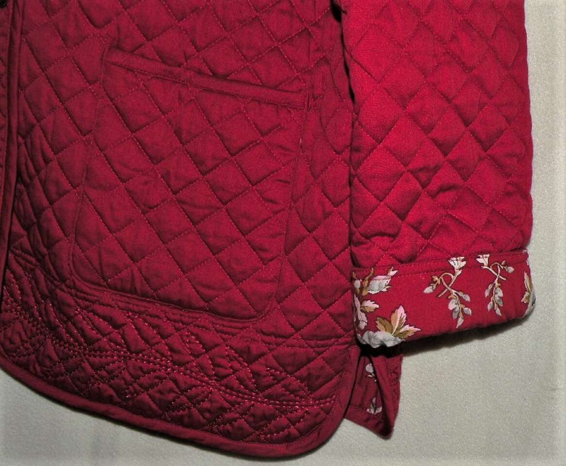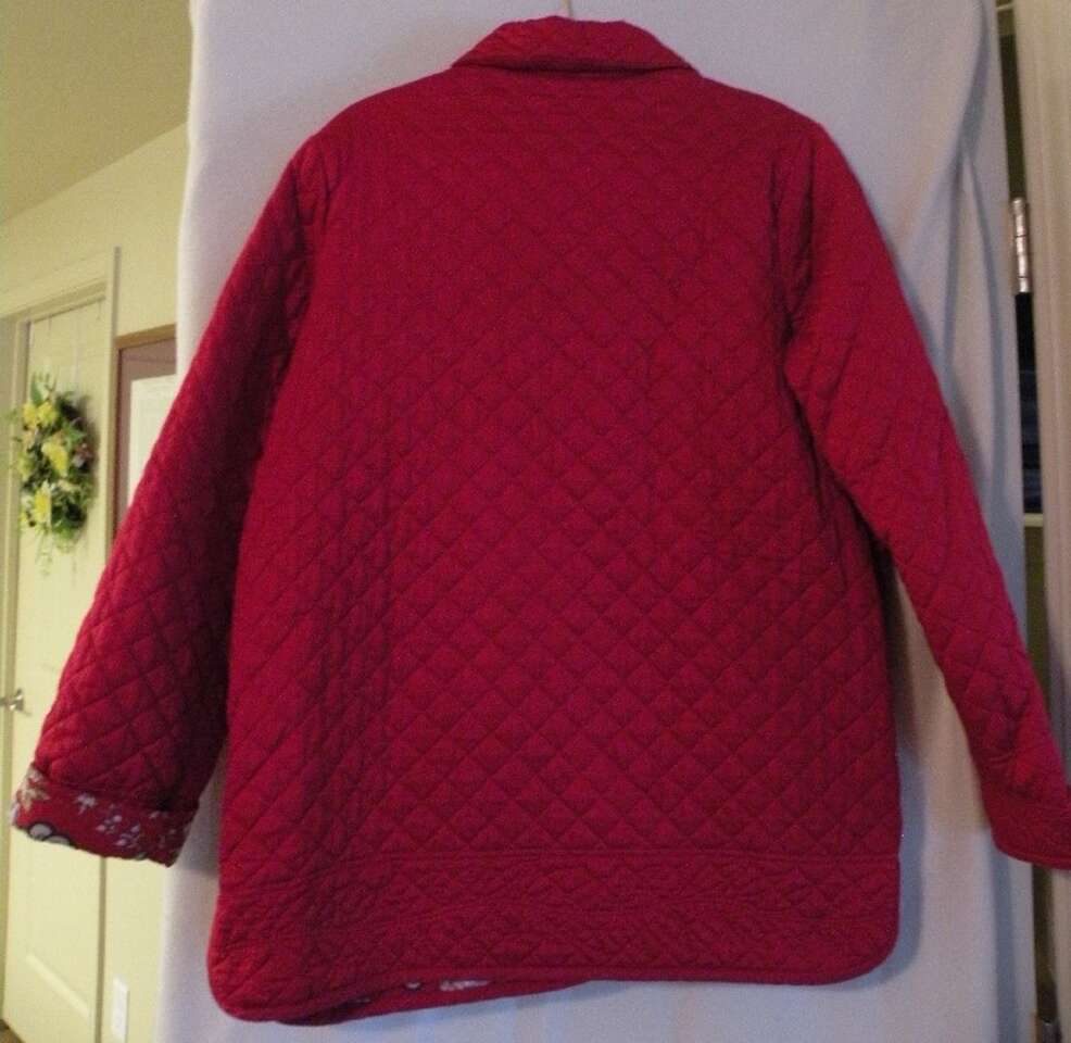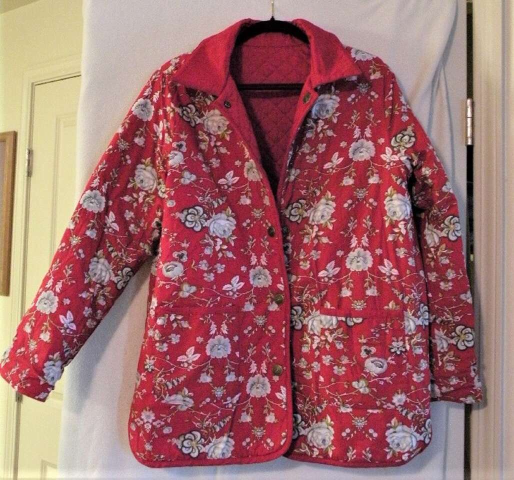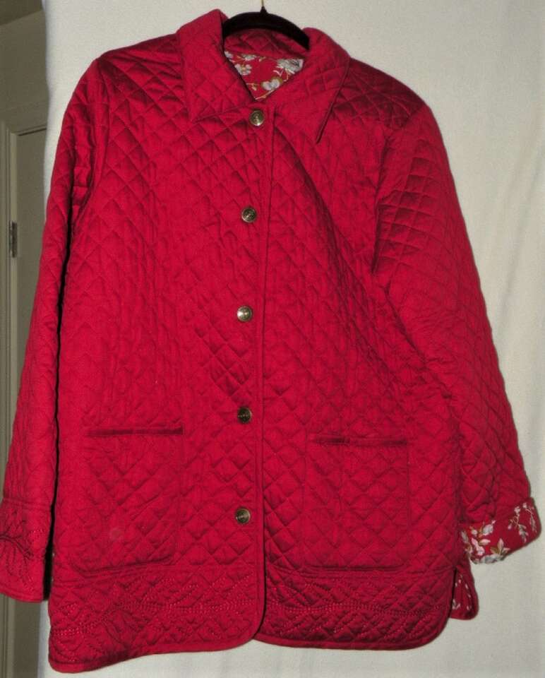 Denim and Company Reversible Quilted Car Coat w Embroidered Bottom and Cuffs. Denim and Company long deep red car coat is reversible to a flower print. Closure is stylish snaps on both sides. The cuffs and bottom of the red side is embroidered with a leaf pattern. Deep front pockets are on both sides. Pointed collar is red quilted cotton on the quilted side and red cotton on the other. Cuffs can be turned up or worn down. Shoulders are 16 inches across. Sleeve length is approximately 24 inches. Length including collar is 32 inches. Chest is approximately 36 inches. Widest area at hip length is 48 inches. Coat is medium weight and a size large. It is in excellent condition with no stains and has had very little wear. Snaps are securely fastened and heavy duty. it is a great coat for fall and early winter and is very versatile.