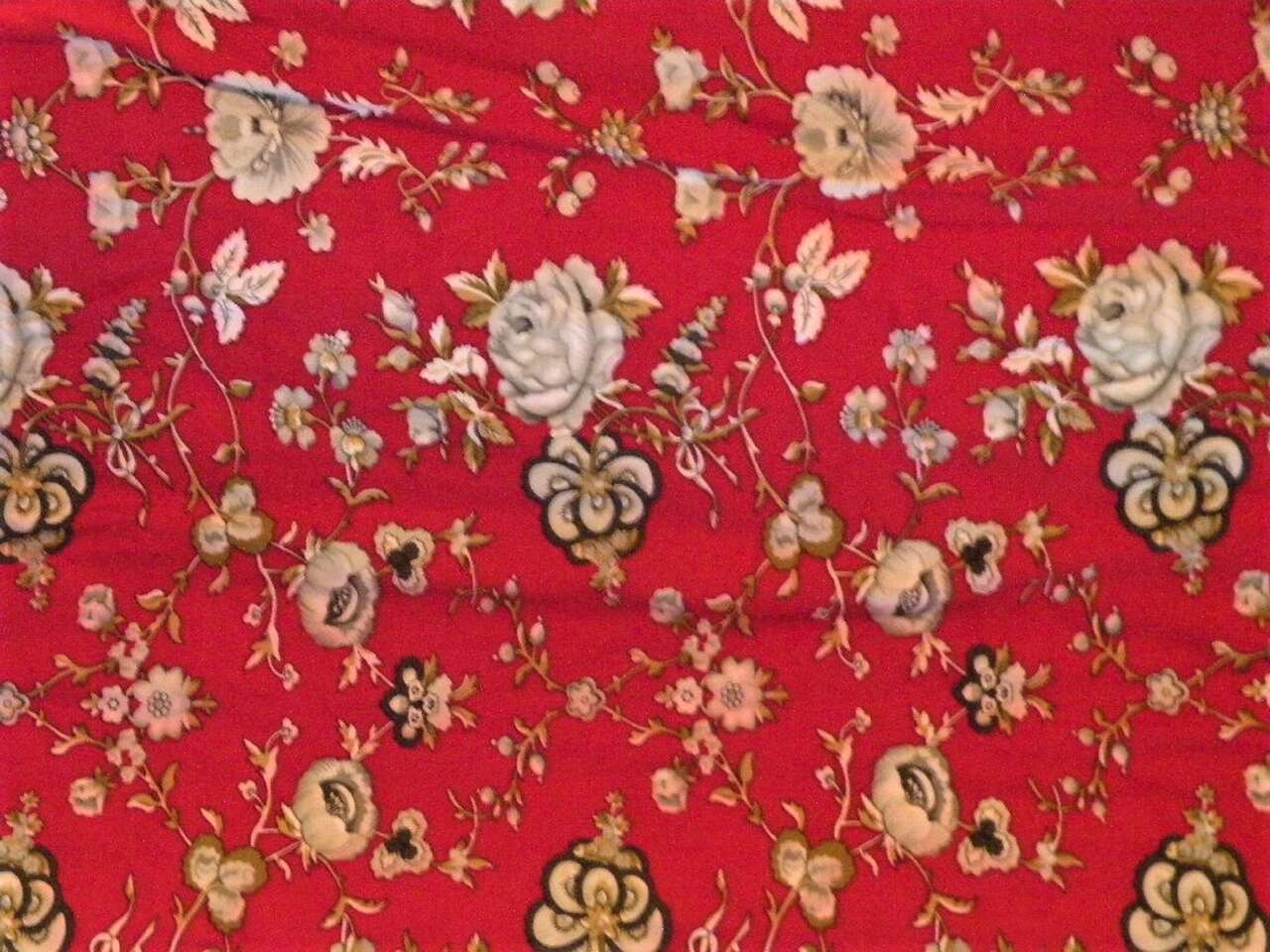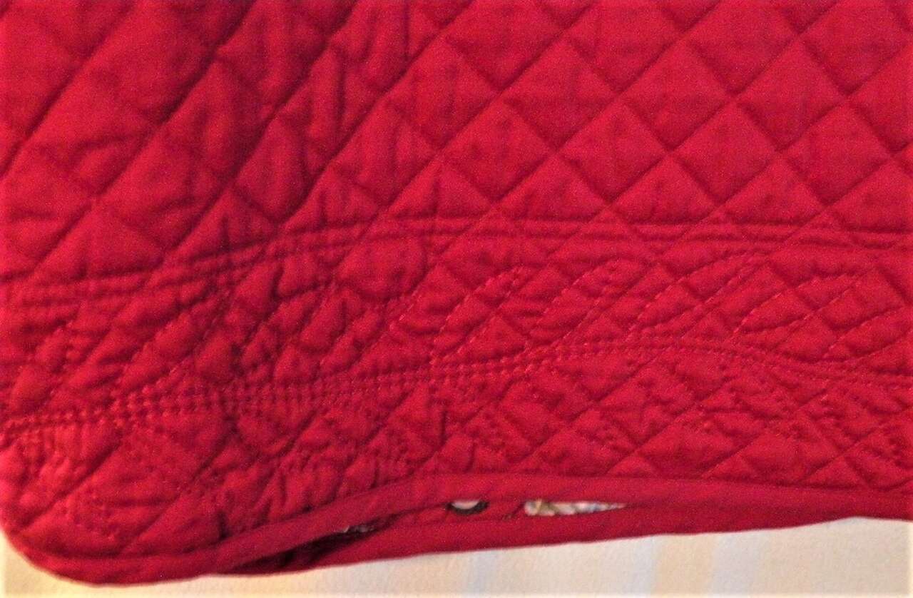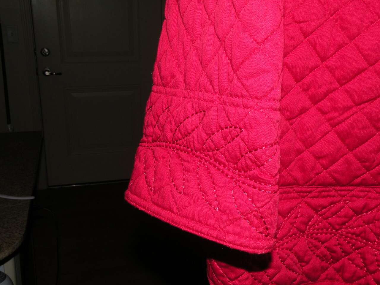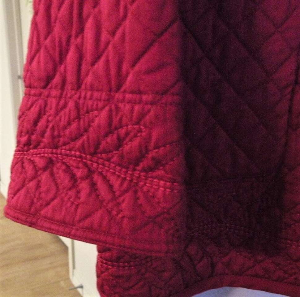 Denim and Company Reversible Quilted Car Coat w Embroidered Bottom and Cuffs. Denim and Company long deep red car coat is reversible to a flower print. Closure is stylish snaps on both sides. The cuffs and bottom of the red side is embroidered with a leaf pattern. Deep front pockets are on both sides. Pointed collar is red quilted cotton on the quilted side and red cotton on the other. Cuffs can be turned up or worn down. Shoulders are 16 inches across. Sleeve length is approximately 24 inches. Length including collar is 32 inches. Chest is approximately 36 inches. Widest area at hip length is 48 inches. Coat is medium weight and a size large. It is in excellent condition with no stains and has had very little wear. Snaps are securely fastened and heavy duty. it is a great coat for fall and early winter and is very versatile.