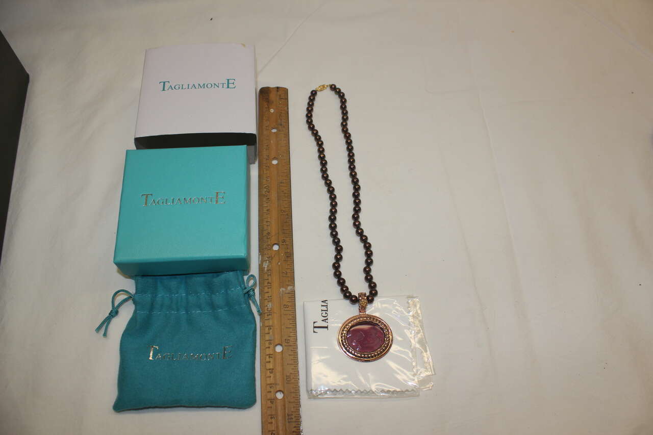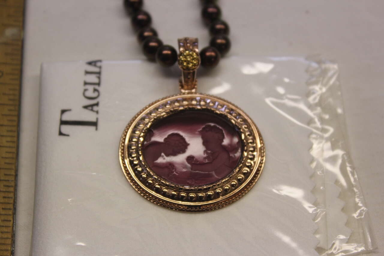 Tagliamonte Cameo Pendant, rose gold plated 925 sterling silver setting with Etruscan Purple Venetian Intaglio Cameo with two Cupid Figures and 14k Enhancer Bale. Comes with Bronze Pearl Necklace with 14K safety clasp, necklace is 17 long. Necklace is brand new in the factory packaging including storage pouch, cleaning cloth and paperwork explaining Tagiamonte history and cameo description. Hand made in Italy, high quality craftsmanship.