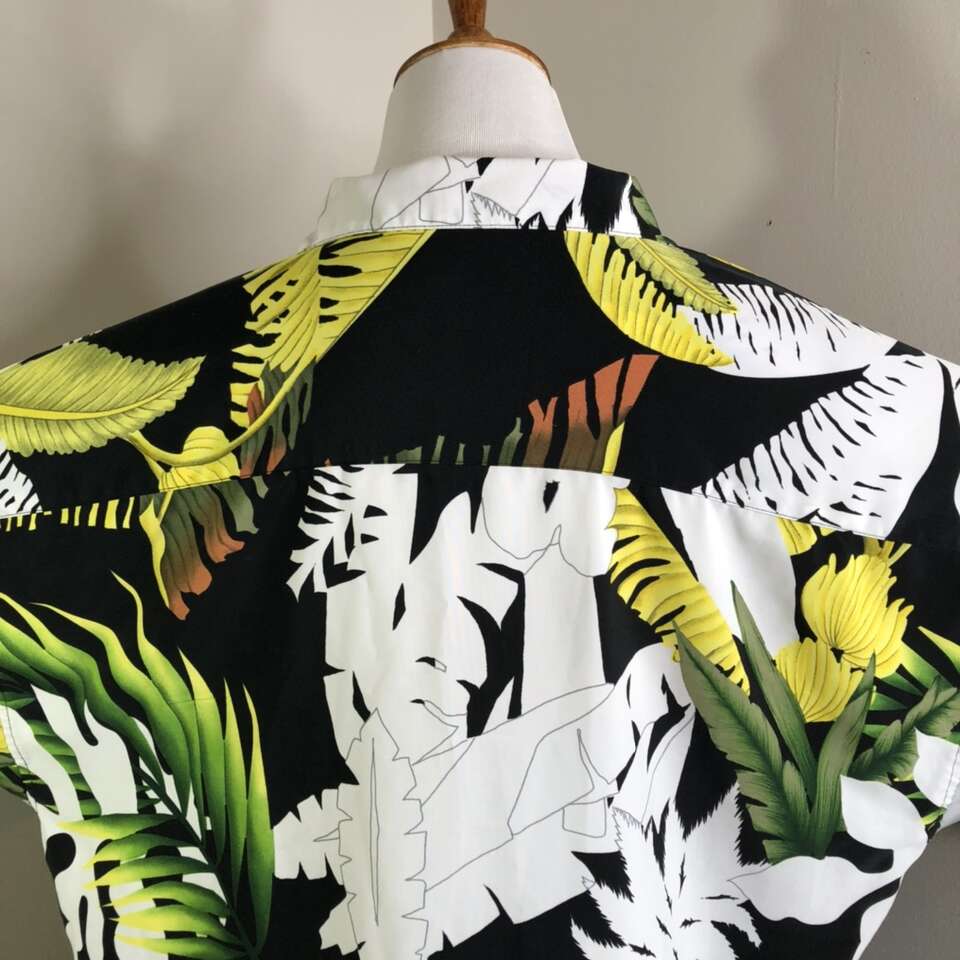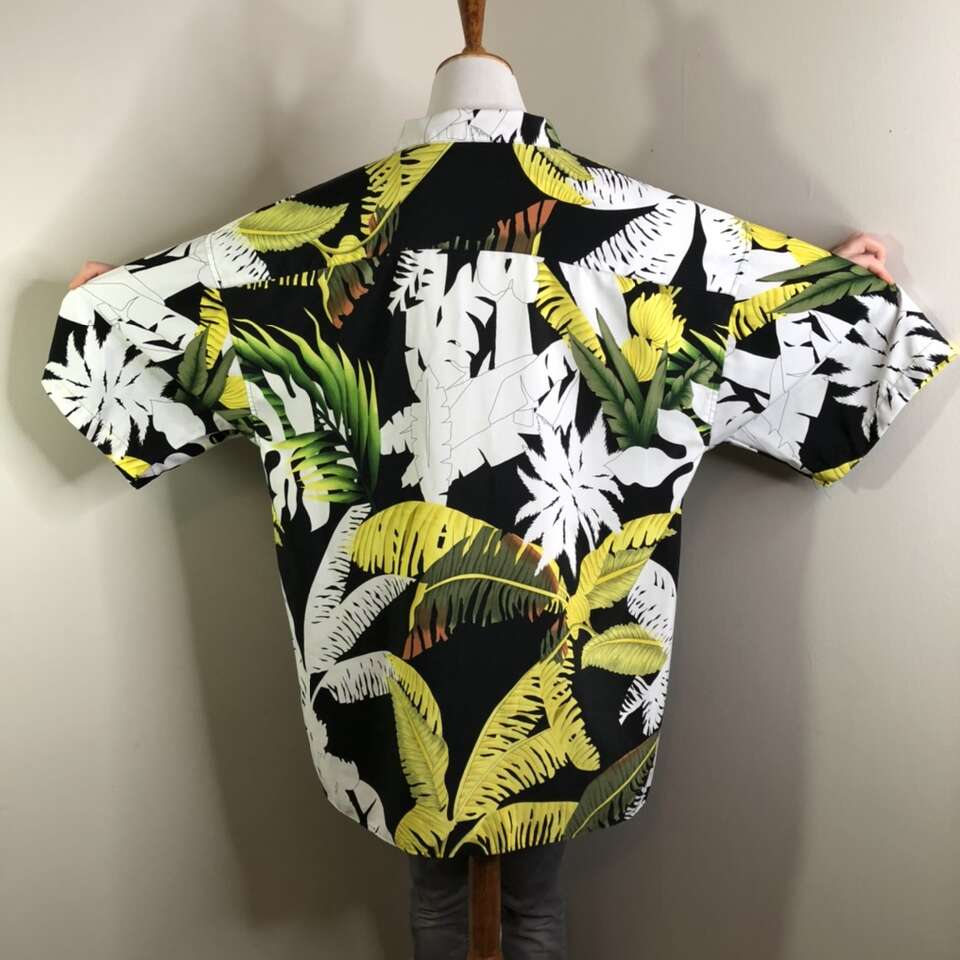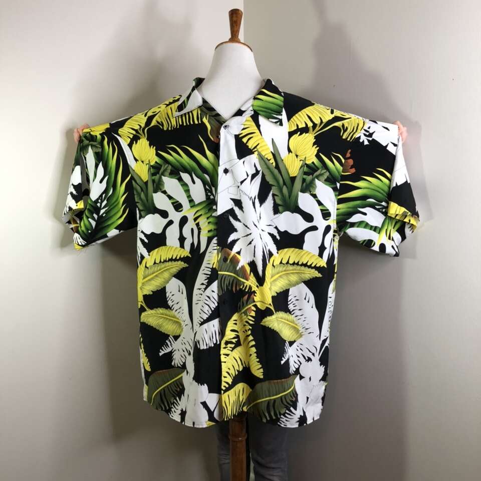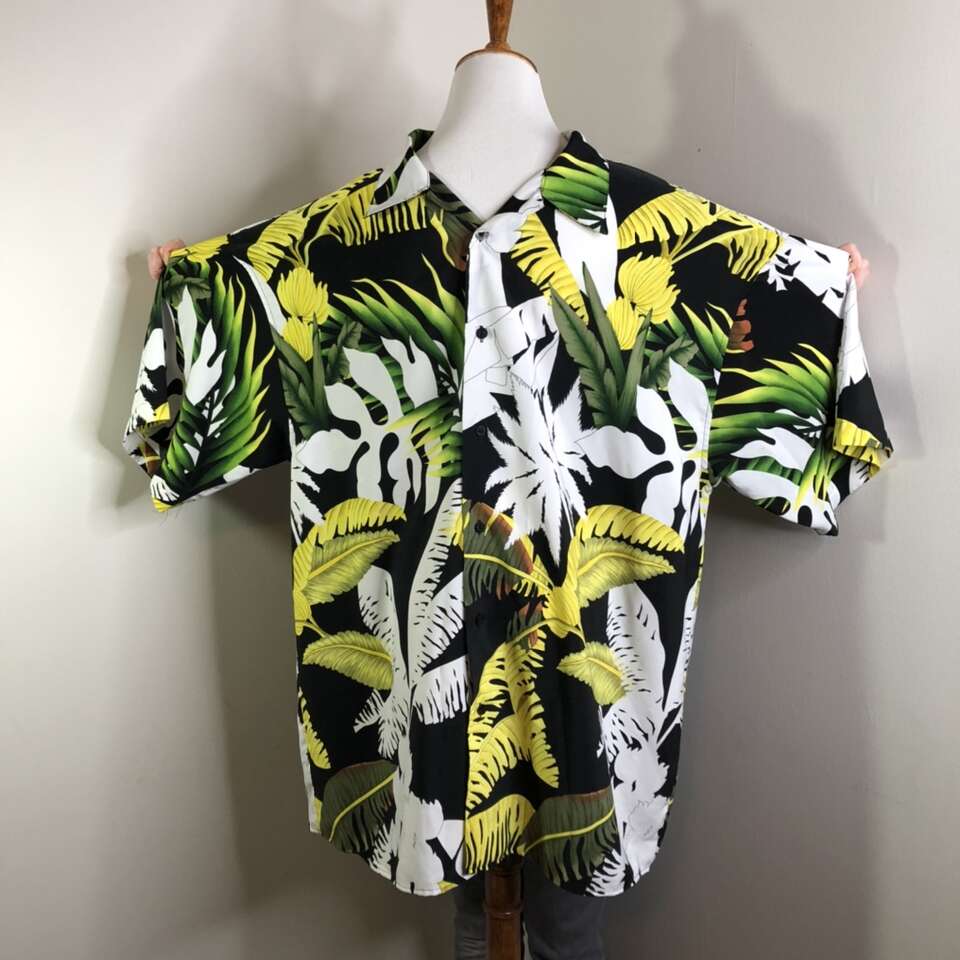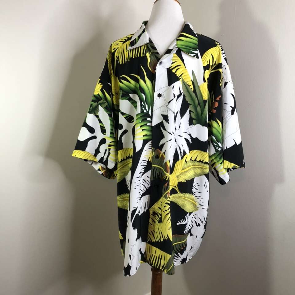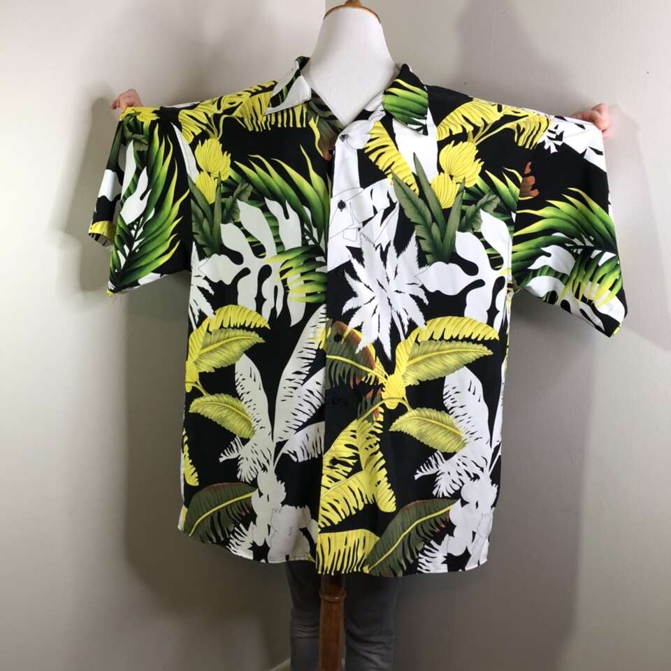 Gently used XXL Men’s Hawaiian Casual Shirt. Striking white yellow & green on a black background in sturdy smooth & silky Polyester. 33” long Pit to pit 26”. Sleeve length: 11” Komen Brand Photographs are of the exact shirt you are purchasing. No rips, tears, stains, or defects. Smoke free. Delivery available to a convenient location when in your area for $5. Buy more than one shirt and discount $5 a shirt.