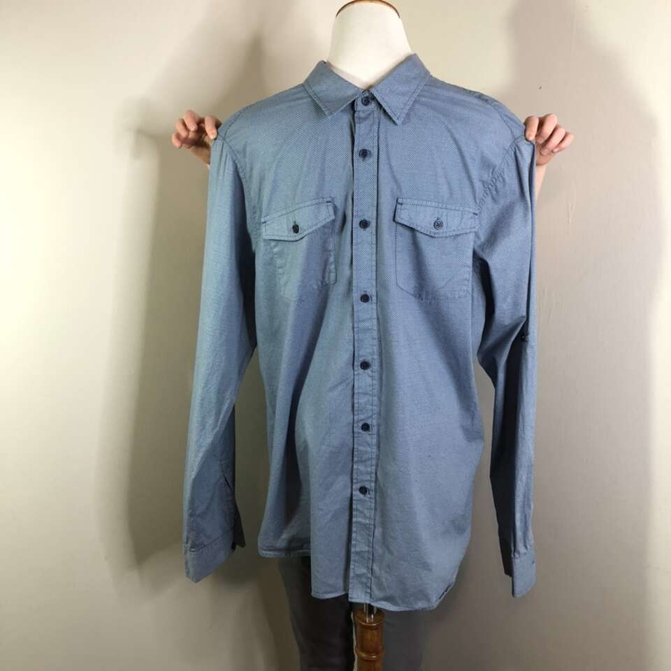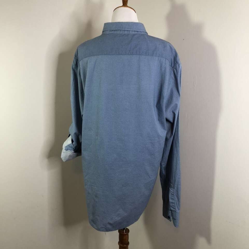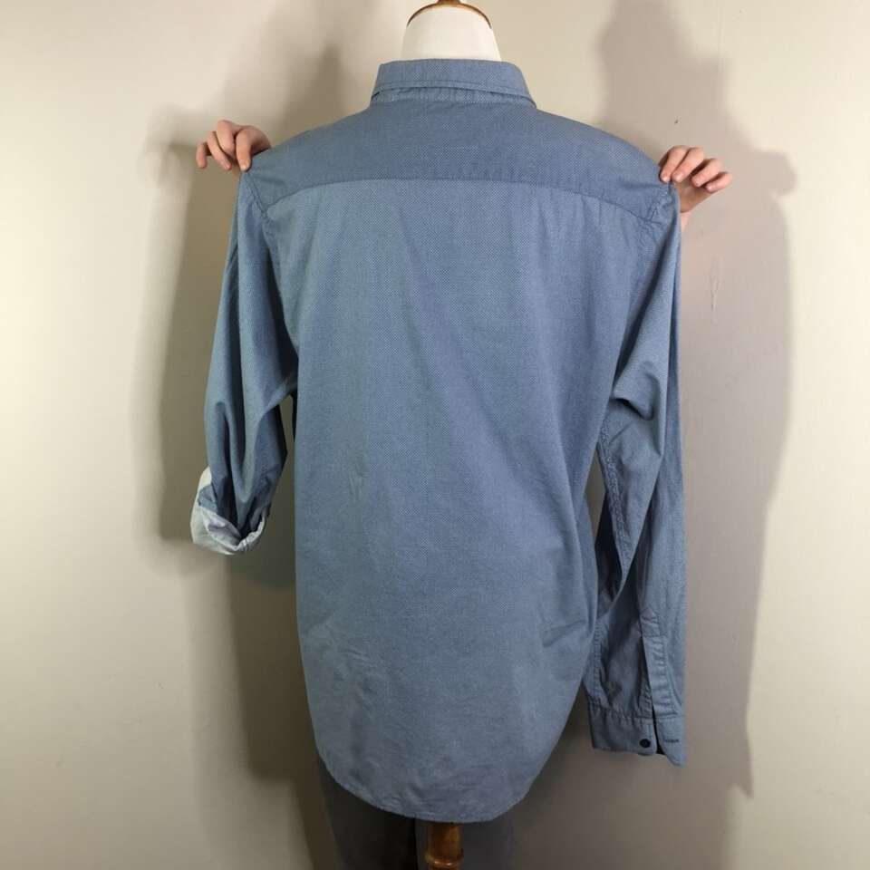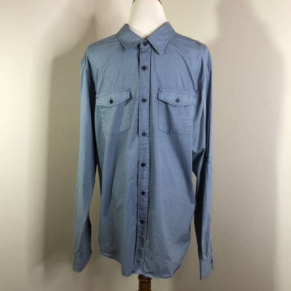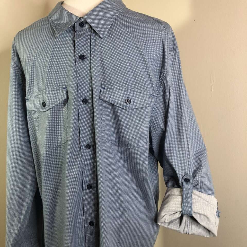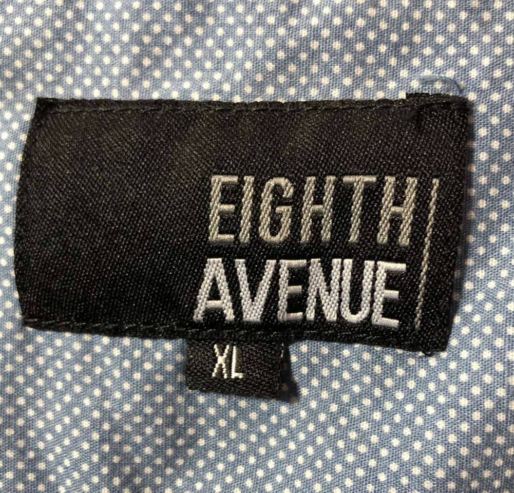 Gently used Men’s XL Button-down Shirt. Colonial blue with tiny white pin-dots print of comfortable & breathable 100% Cotton. Long-Sleeves have fold-up option with button strap to hold up the folded sleeve. Has two buttoned chest pockets. Comes with an extra blue button. Length: 30” pit to pit: 22.5” Sleeve length: 26.75” Size XL “EIGHTH AVENUE” Brand Purchase 2 or more men’s shirts and receive a discount of $5 per shirt. Photographs are of the exact shirt you are purchasing. No Rips, tears, stains, or defects. Smoke free. Delivery available to a convenient location when in your area for $5.