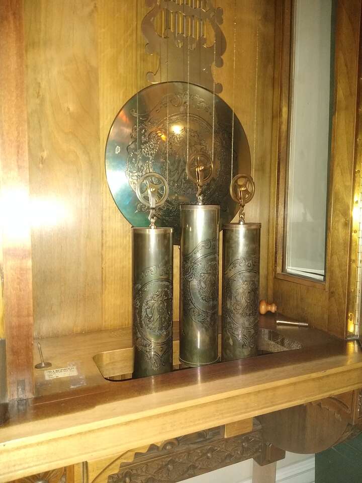 GAZO OAK HANGING WALL CLOCK, H 88", W 24":Described as a 'Encino' clock, having a crown molding above carved vine designs, white porcelain face inscribed: 'Gazo'; Roman numerals with hour and seconds hands; monogrammed brass pendulum and weights (3). Beveled glass access doors. German brass movement with chimes; three key wind; Very good condition.