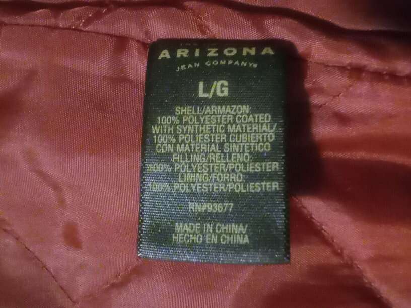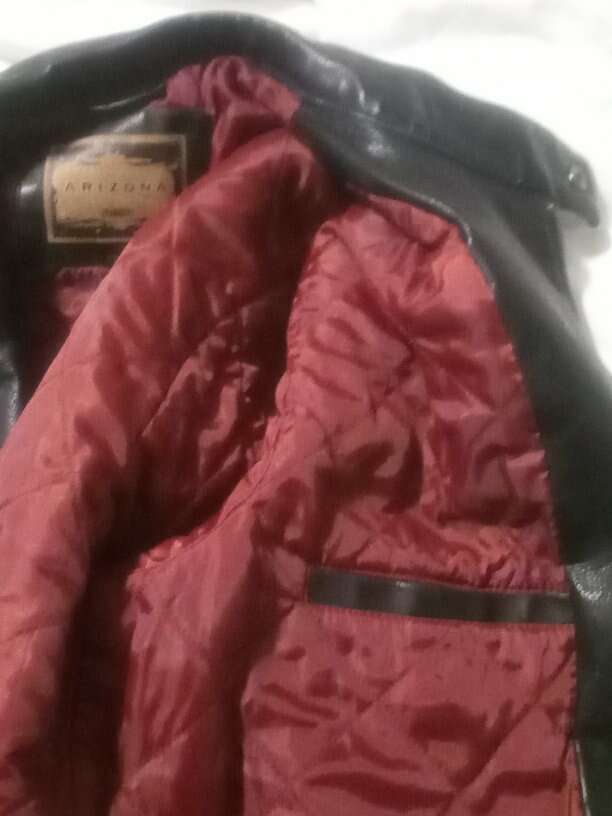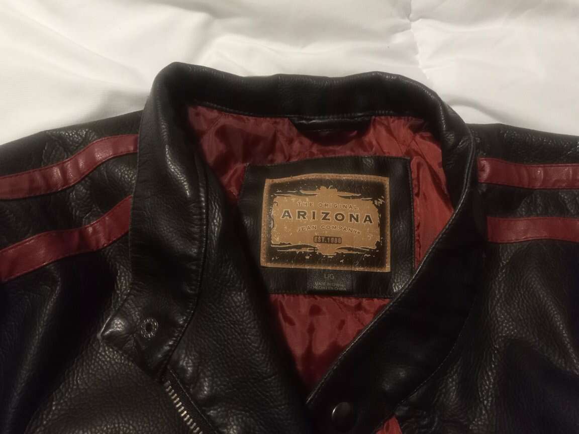 Price Reduced Again This men's Arizona jacket, size Large, is in excellent condition. It has been worn very little. From a smoke-free home. It has a zipper front with a snap collar closure. It is black with gray piping, and has what I would call burgundy striping with matching quilted burgundy interior. It has two front pockets and one interior pocket. It is NOT leather. See tag for details. Cash or Venmo only.