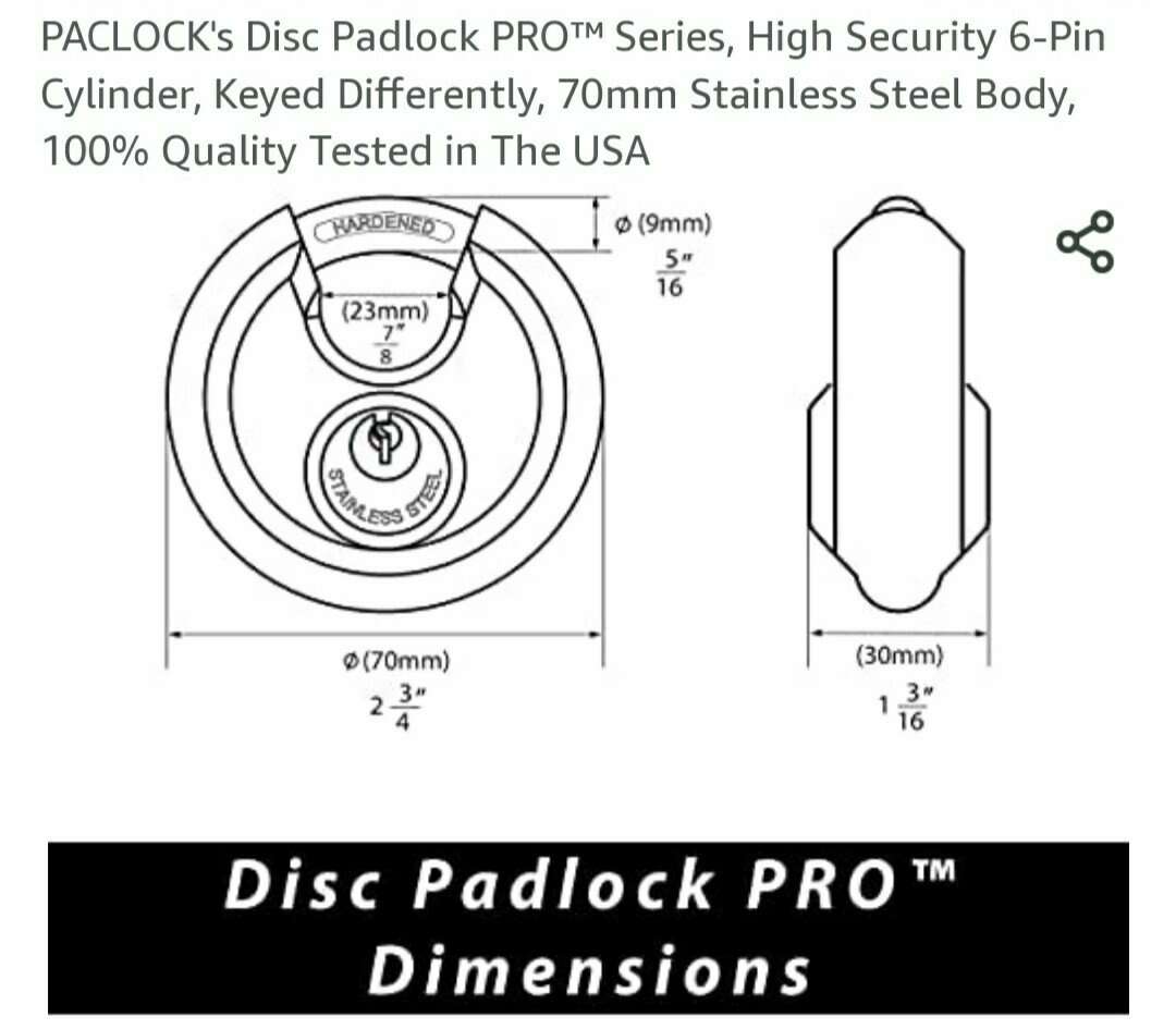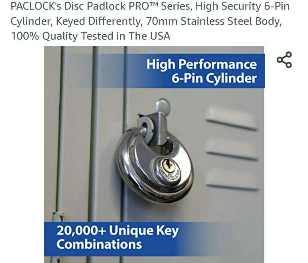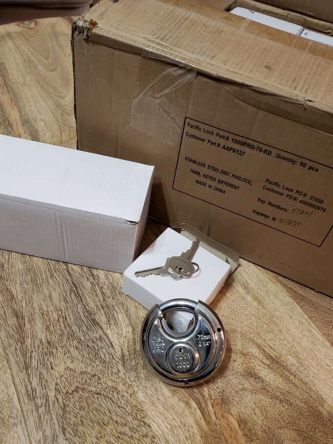 All new security disc padlocks. Each keyed differently and have 2 keys per lock. See all pictures for product information and description. Selling at $5.00 per lock, or $20 for box of 5. These are great for shipping containers and storage units.