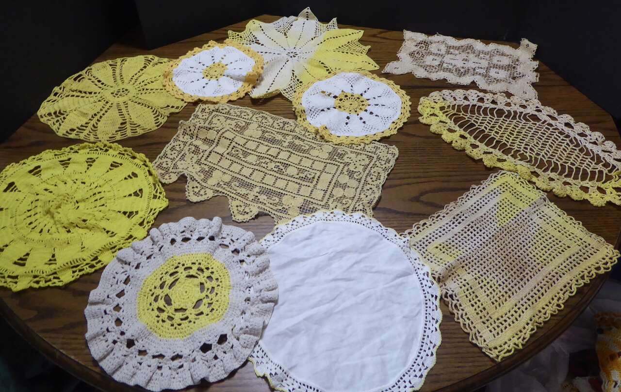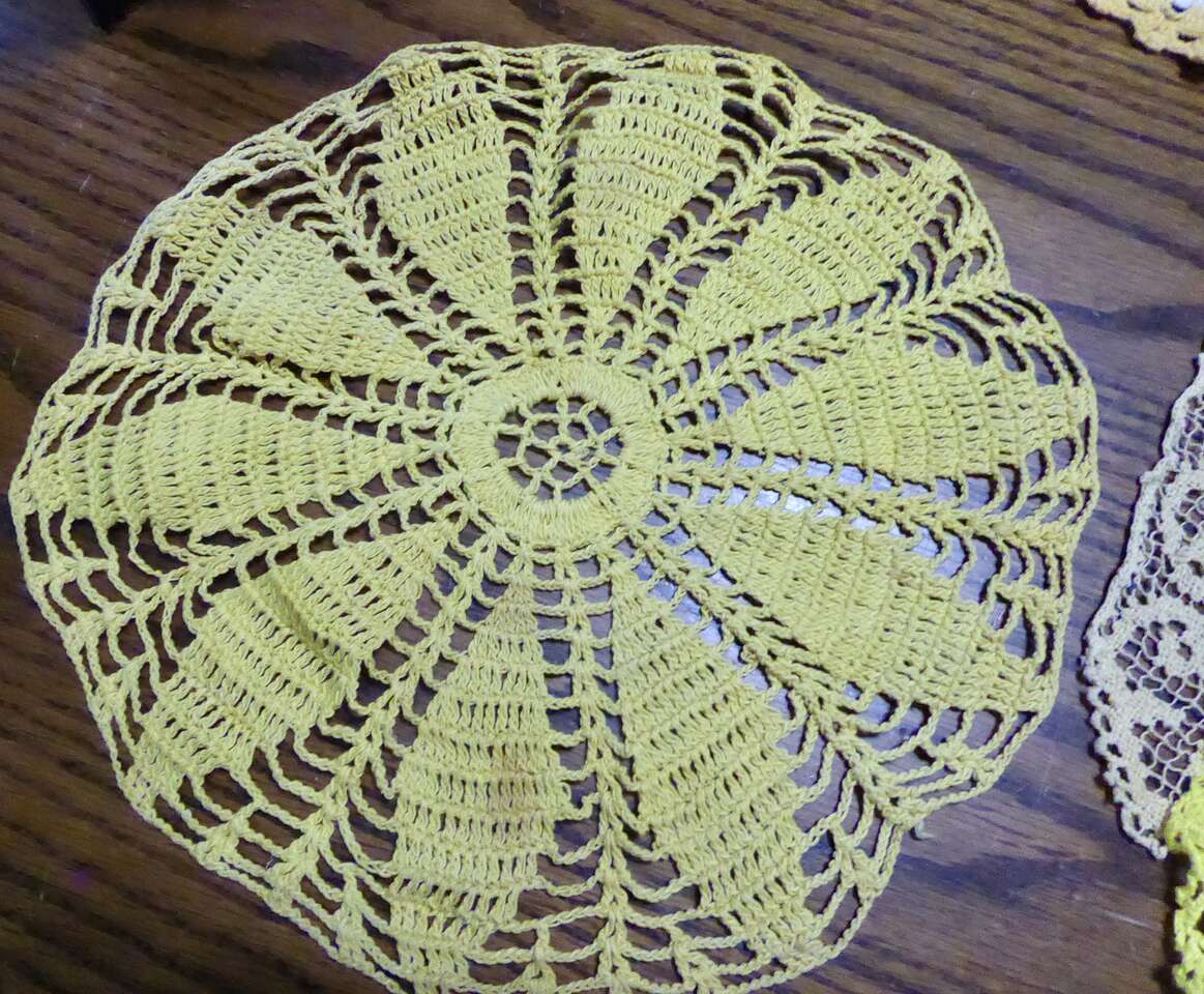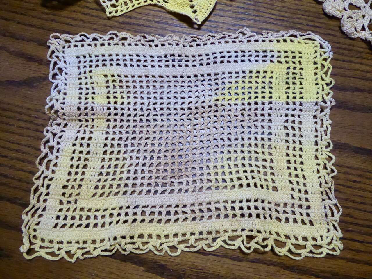 Please Note… there are a few that have been by accidentely bleached by the sun so they got sun-bleached and discolored but they could be re- dyed to any color of your choice or back to their original yellow- whatever you decide is great! We will discount these pretty doilies if you would like them at a good price for you.